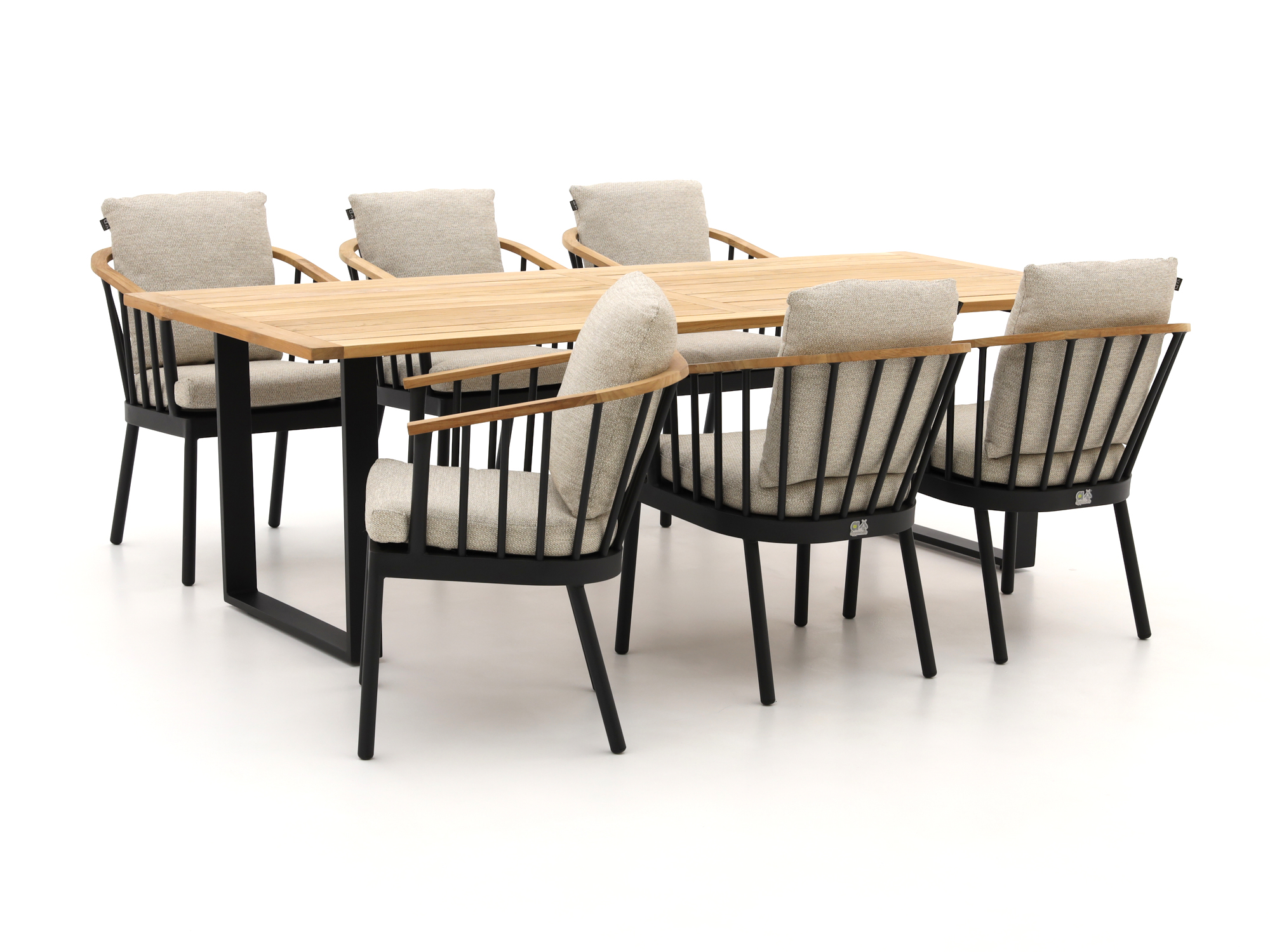 De Apple Bee Condor dining tuinset is een ruime set voor 6 personen, ideaal als je graag buiten eet met familie of vrienden en houdt van een strakke, zwarte look gecombineerd met warm teakhout. De aluminium stoelen en tafelpoten zijn licht van gewicht, dus je schuift de set makkelijk aan de kant als je je terras anders wilt indelen. Het teakhouten tafelblad is sterk en weerbestendig en vergrijst na verloop van tijd naar een lichte grijstint, wat een rustige, natuurlijke uitstraling geeft. Je krijgt er comfortabele kussens bij, zodat je ook bij een lange barbecue relaxed blijft zitten. Zoek je een grote, praktische eetset voor buiten waar je niet de hele dag naar om hoeft te kijken, dan zit je met deze Condor set letterlijk goed.