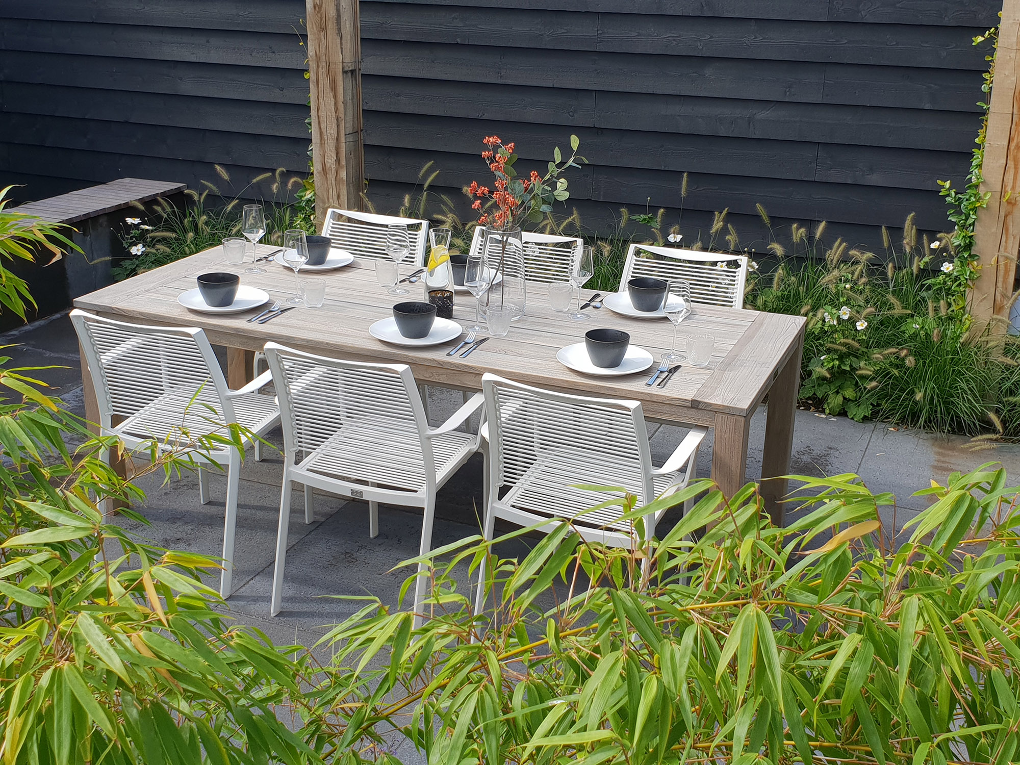De Apple Bee Hawaii/ROUGH-S dining tuinset is een stijlvolle en praktische keuze voor je tuin. Deze 7-delige set biedt plaats aan zes personen en is ideaal voor gezellige diners in de buitenlucht. Het teakhouten tafelblad en onderstel geven de set een natuurlijke uitstraling, terwijl de aluminium stoelframes zorgen voor een stevige en onderhoudsarme basis. De kunststof zittingen zijn niet alleen comfortabel, maar ook makkelijk schoon te maken. En het beste van alles? De stoelen zijn stapelbaar, waardoor je ze eenvoudig kunt opbergen wanneer je ze niet gebruikt. Perfect voor een ontspannen avondje buiten eten met vrienden of familie!