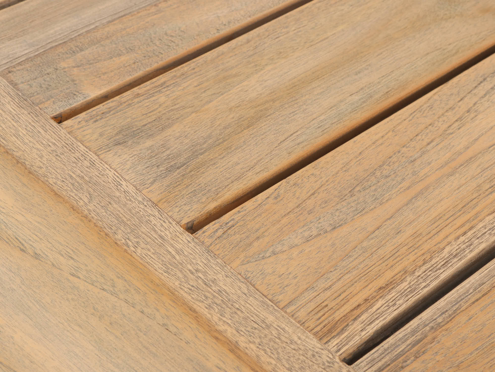 Teakhouten tafelblad en onderstel: Dit materiaal is bestand tegen alle weersomstandigheden en biedt jarenlang plezier zonder splinters. Het geeft de set een stevige en natuurlijke uitstraling.
