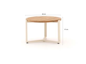 De Apple Bee Monaco lounge tuintafel met rond tafelblad van 60 cm is een compacte loungetafel, ideaal naast of voor je loungeset als plek voor drankjes, hapjes en een tijdschrift. Het teakhouten blad in naturel kleur geeft een warme, rustige look en past goed bij veel tuinsets. Door het aluminium onderstel in gebroken wit is de tafel licht van gewicht, dus je schuift hem makkelijk even opzij als je de loungeset anders neerzet. Met een hoogte van 41 cm sluit hij mooi aan bij de zithoogte van de meeste loungesets, zodat je niet hoeft te rekken voor je glas.