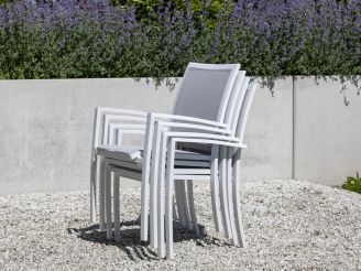 De Bellagio Anzio dining tuinstoel in wit is een stijlvolle toevoeging aan je tuinset. Deze stoel combineert een modern design met praktisch gebruiksgemak. Dankzij het aluminium frame is de stoel niet alleen licht van gewicht, maar ook onderhoudsarm en roestvrij. De zitting van textileen vormt zich naar je lichaam, wat zorgt voor een comfortabele zit, zelfs tijdens lange diners. En als je ruimte wilt besparen, stapel je ze eenvoudig op elkaar. Deze stoel is als een goede vriend: altijd klaar voor een gezellig samenzijn, zonder gedoe.