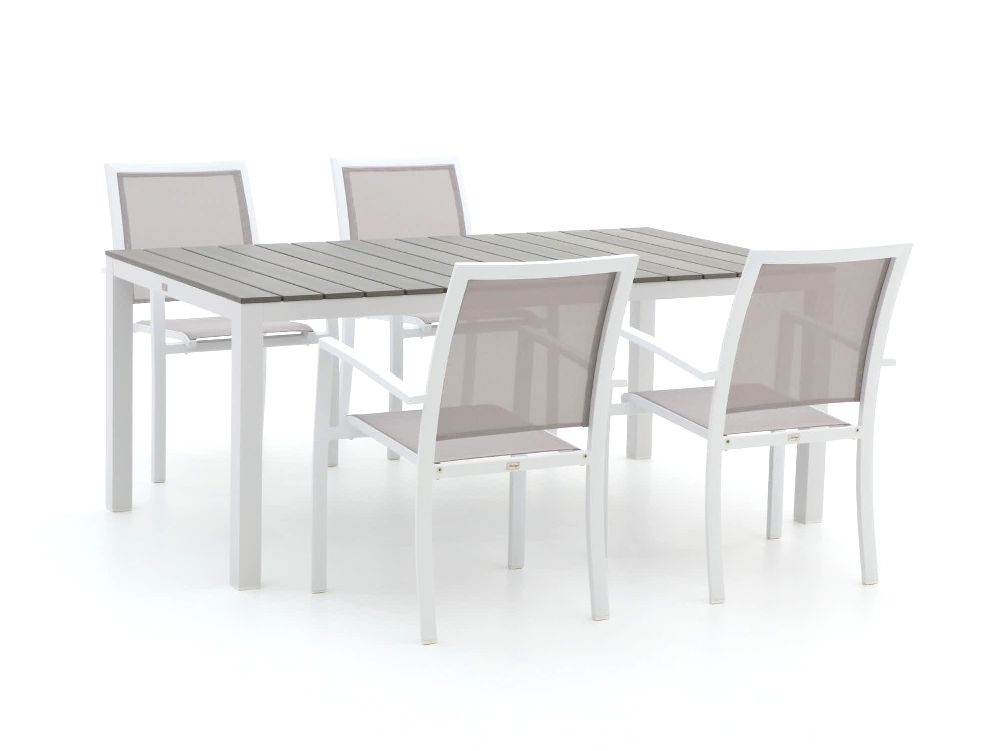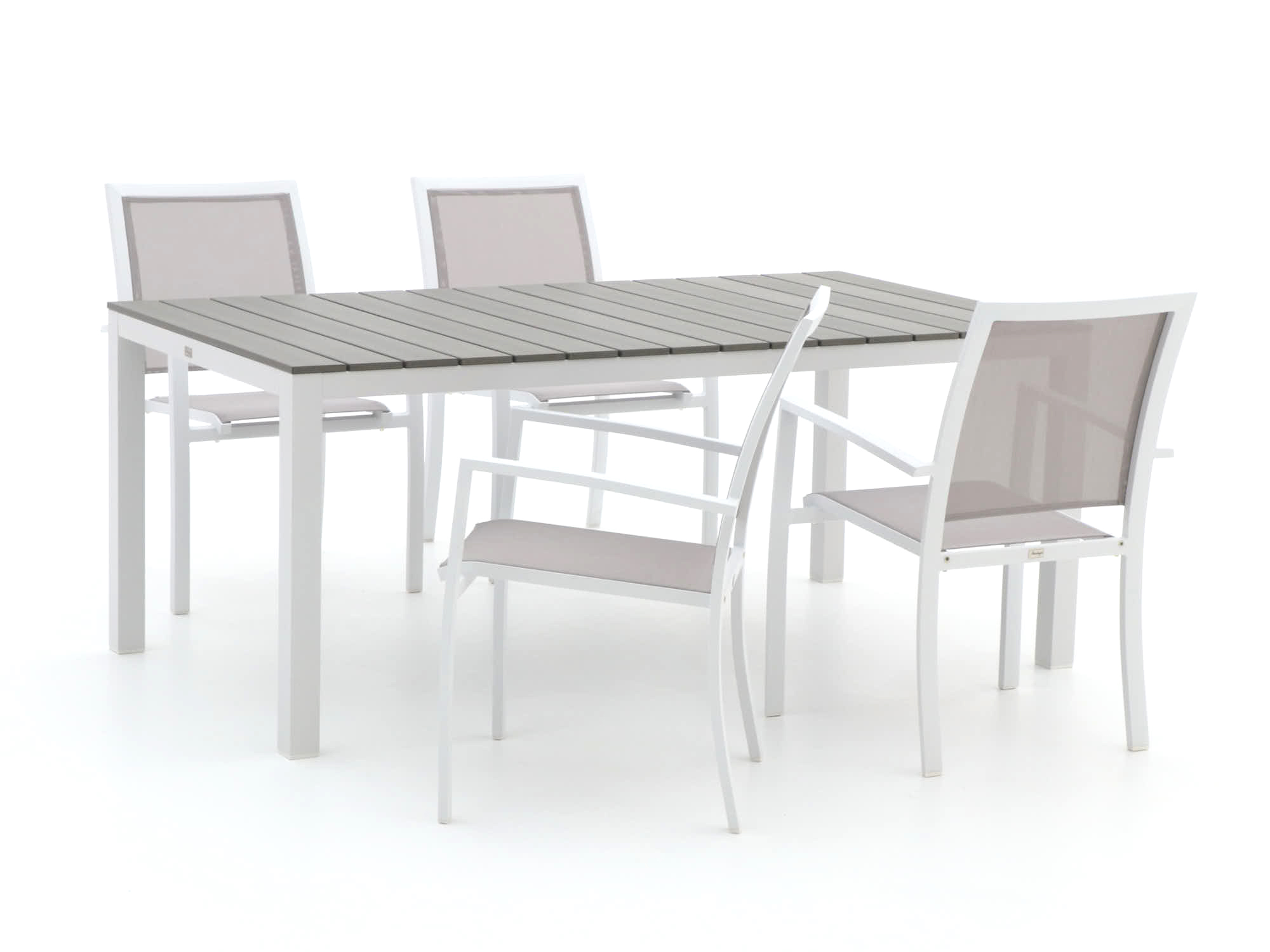Met de Bellagio Anzio/Fidenza dining tuinset haal je een stukje elegantie en comfort naar je tuin. Deze 5-delige set, uitgevoerd in stijlvol wit, biedt plaats aan vier personen en is een perfecte aanvulling voor je buitenruimte. De combinatie van een aluminium frame en een polywood tafelblad zorgt voor een onderhoudsarme en duurzame set die tegen een stootje kan. De stoelen zijn bekleed met textileen, wat zich heerlijk naar je lichaam vormt, zodat je urenlang comfortabel kunt tafelen. En als je klaar bent met genieten, stapel je de stoelen eenvoudig op. Zo houd je je terras lekker ruim en opgeruimd.