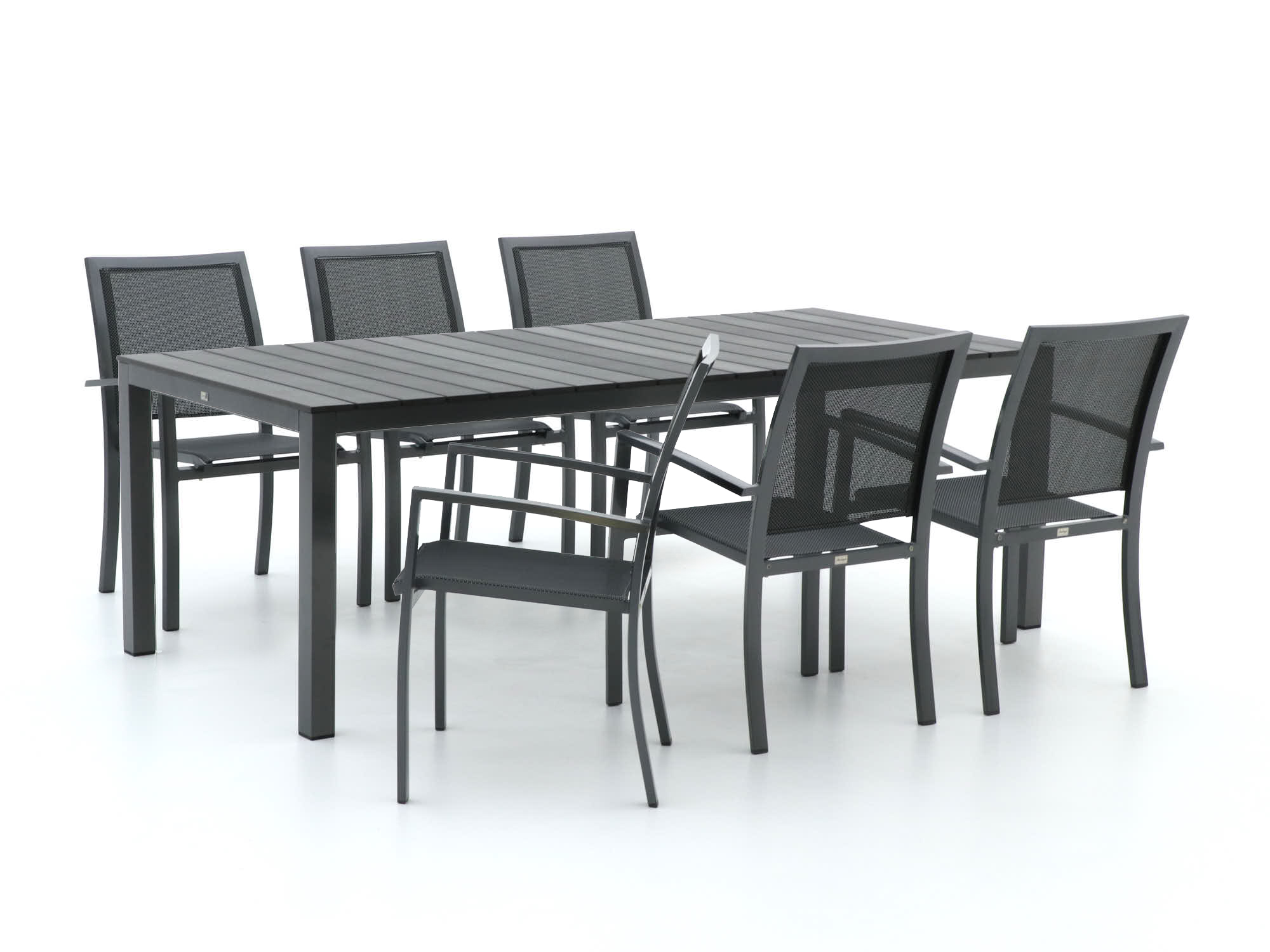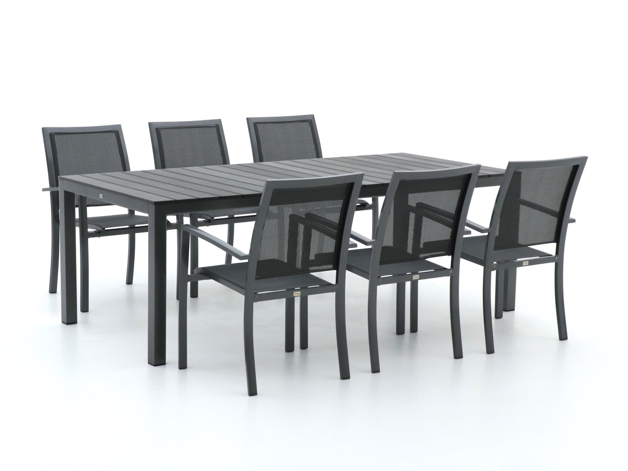 De Bellagio Anzio/Fidenza dining tuinset is als een goede vriend die altijd klaarstaat voor een gezellige avond in de tuin. Met zijn ruime lengte van 220 cm biedt deze set genoeg ruimte voor zes personen om comfortabel aan te schuiven. Het tafelblad van polywood heeft de warme uitstraling van hout, maar is gemaakt van onderhoudsvriendelijk kunststof dat niet kromtrekt of verkleurt. De stoelen zijn voorzien van textileen, een materiaal dat zich soepel naar je lichaam vormt, zodat je urenlang kunt tafelen zonder ongemak. En als de gasten vertrokken zijn, stapel je de stoelen eenvoudig op – handig voor als je de ruimte even anders wilt gebruiken.
