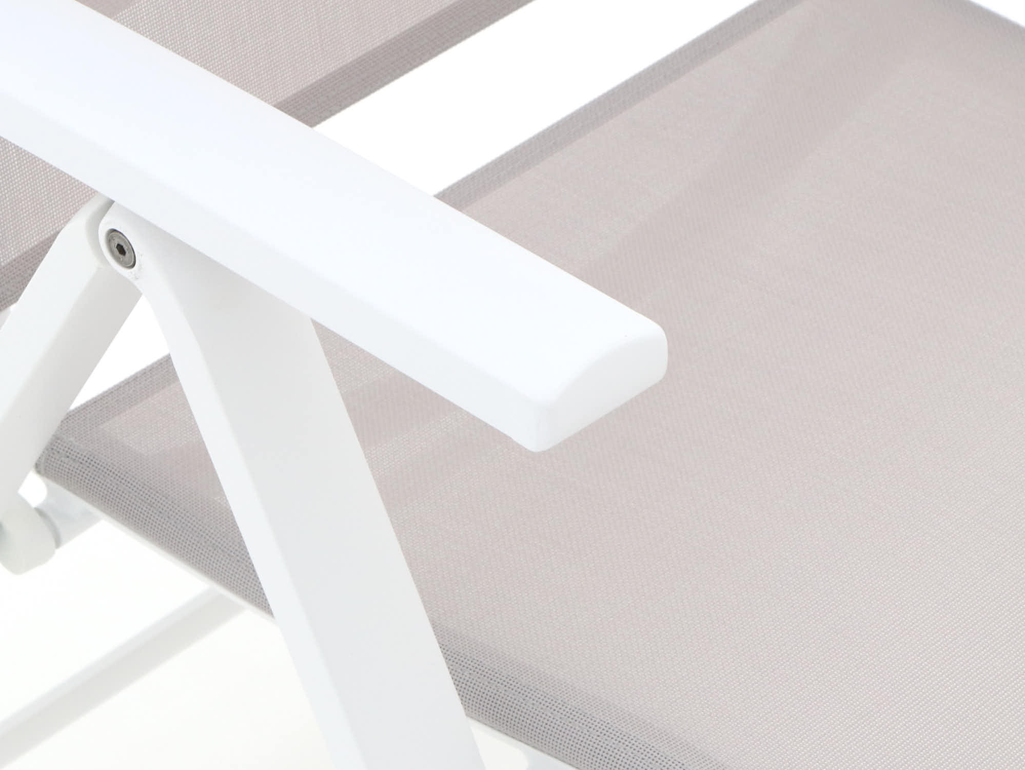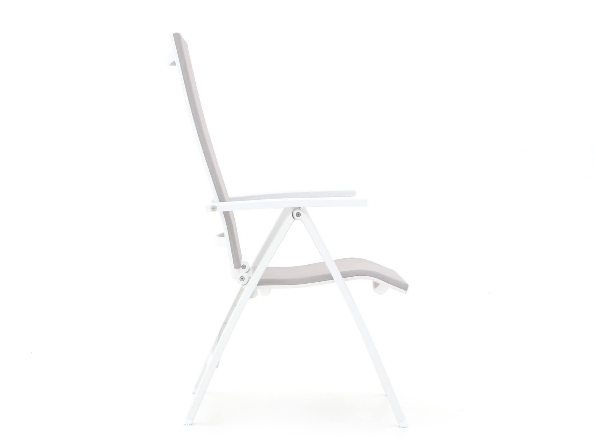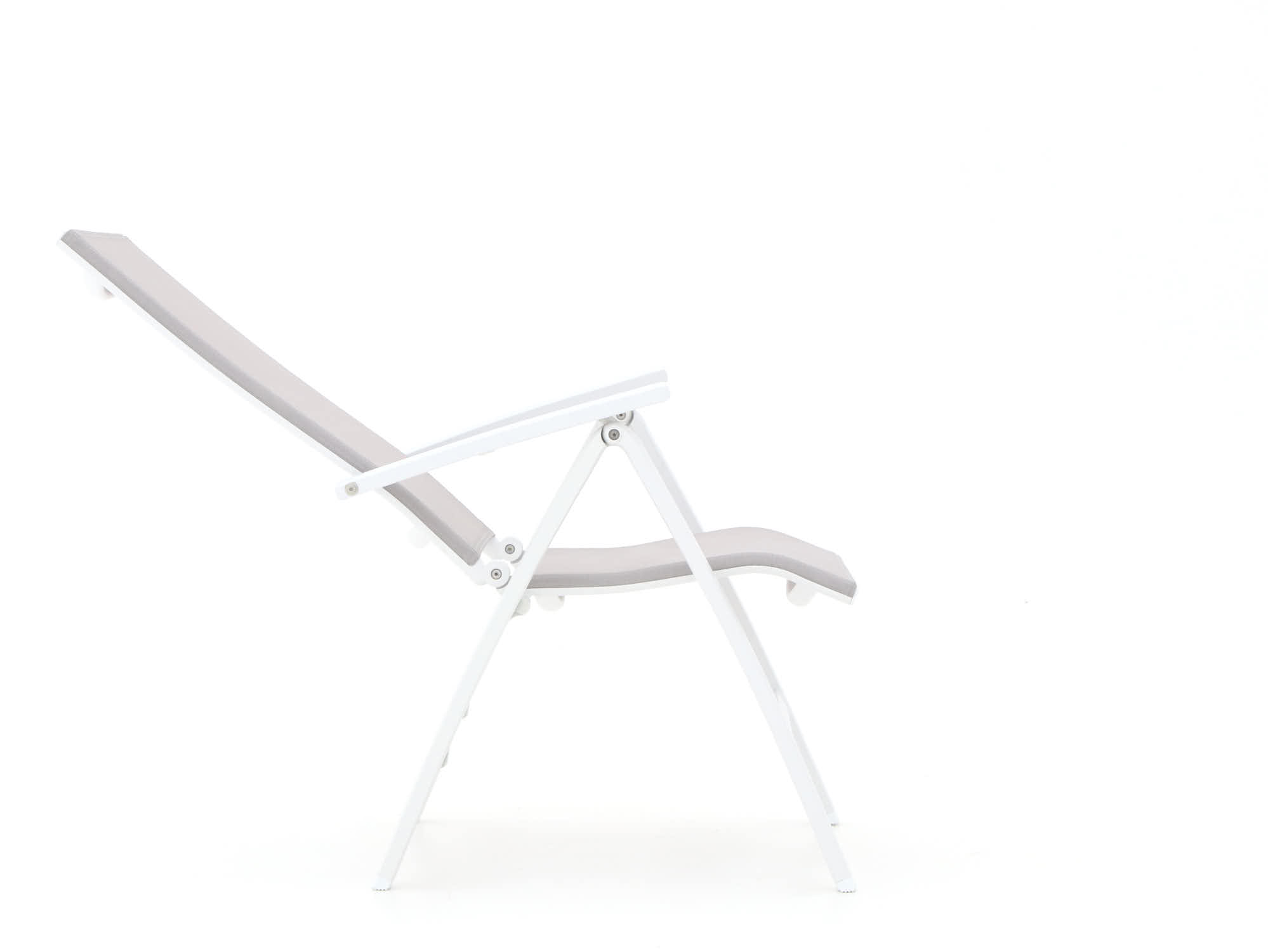 De Bellagio Avenza standenstoel in wit is een stijlvolle toevoeging aan je tuin of terras. Deze stoel biedt niet alleen een moderne uitstraling, maar ook een ongekend zitcomfort dankzij de verstelbare rugleuning. Het aluminium frame is licht van gewicht en onderhoudsarm, waardoor je meer tijd hebt om te genieten van het buitenleven. De zitting van textileen vormt zich naar je lichaam, ideaal voor lange zomerdagen aan tafel. En als je klaar bent met loungen, klap je de stoel eenvoudig in voor een ruimtebesparende opslag. Wie had gedacht dat ontspanning zo praktisch kon zijn?