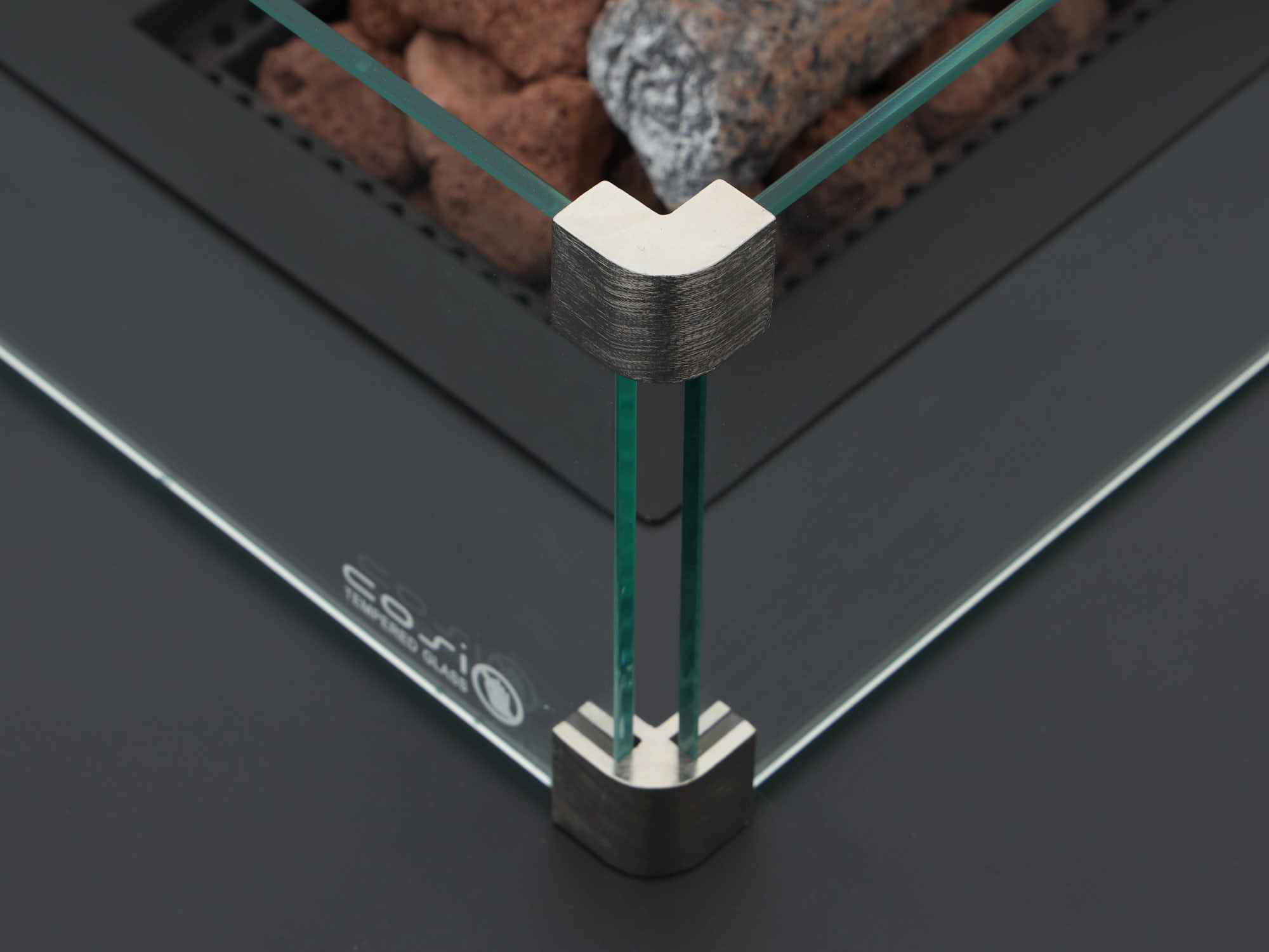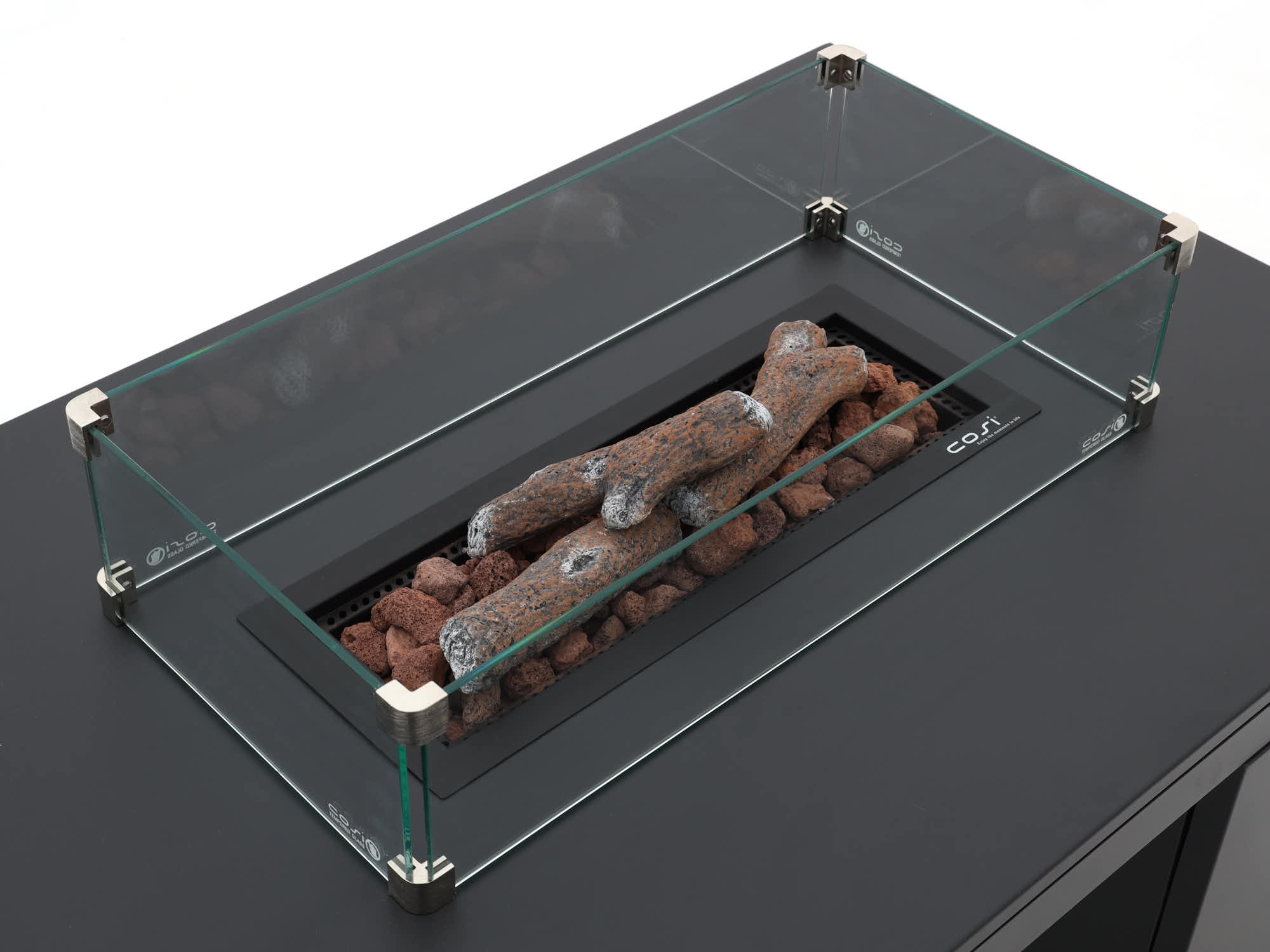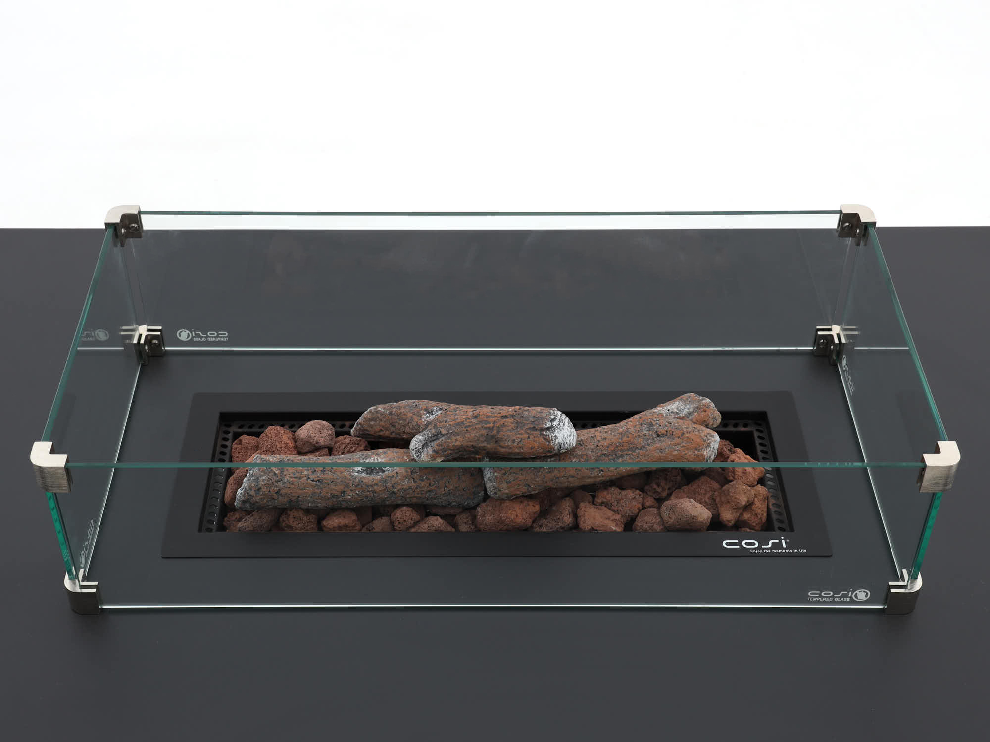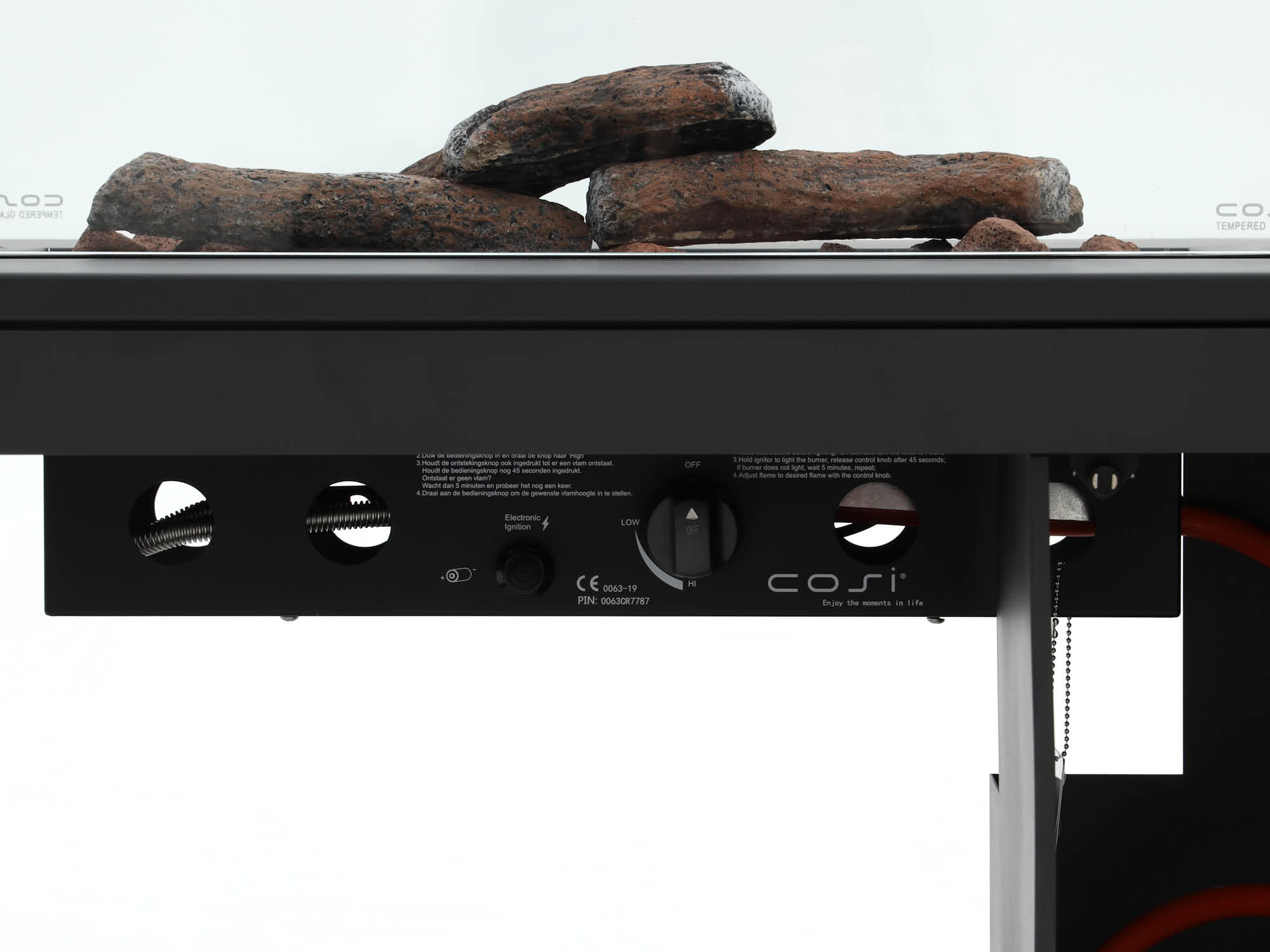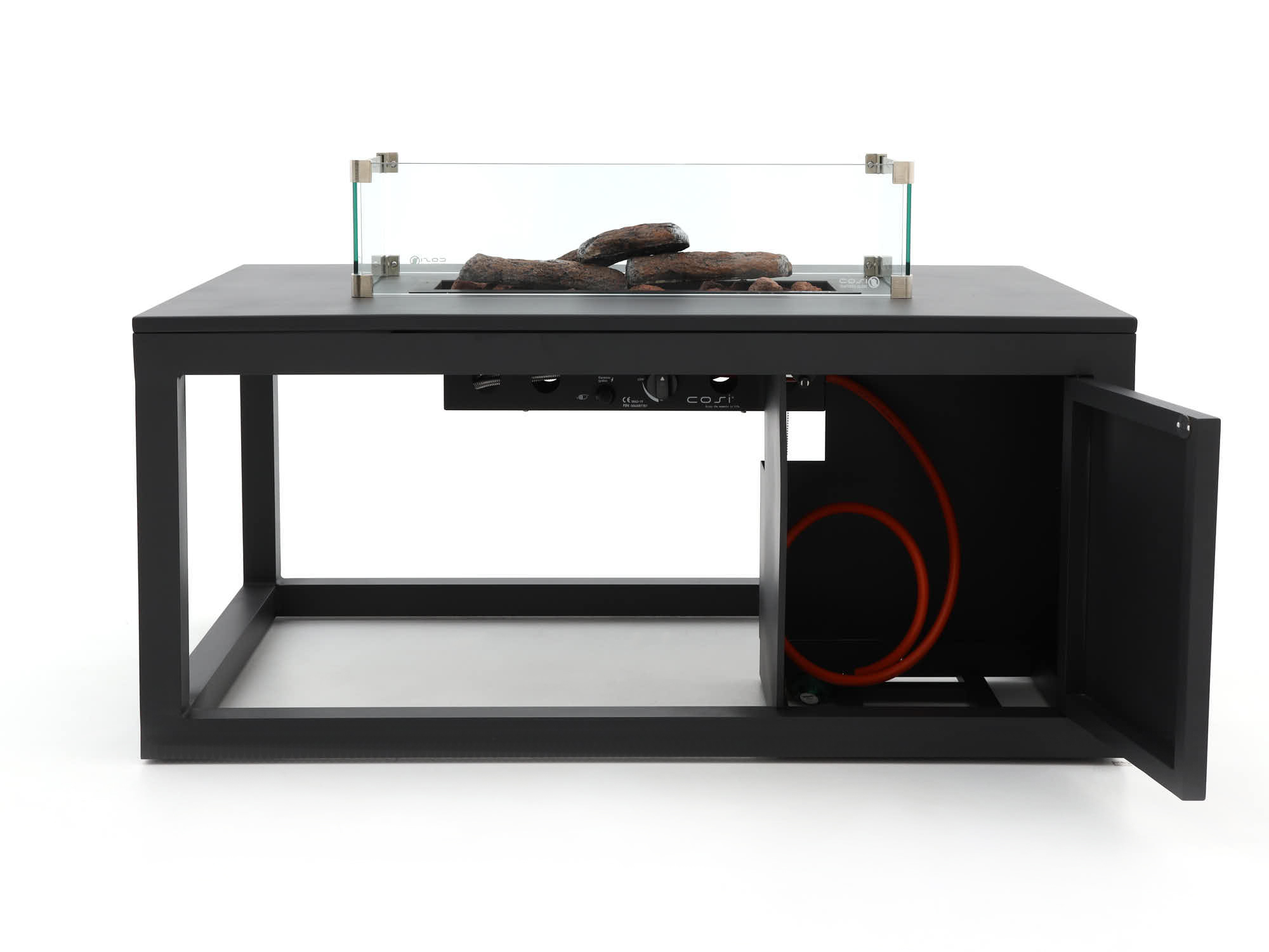 De Cosiraw lounge vuurtafel is ook gemaakt van aluminium. De vuurtafel wordt geleverd inclusief een glasset, een 30mbar vlamregelaar, een gasslang, keramische houtstammen en lavastenen. De glasset schermt de vlammen af, voorkomt dat kinderen en huisdieren te dichtbij het vuur komen en heeft een chique uitstraling. De vuurtafel werkt op propaangas, de gasfles wordt niet meegeleverd. In de Cosiraw vuurtafel past een 5kg gasfles. Aan de zijkant van de vuurtafel zit een luik voor de gasfles. Het verbruik is circa 0,6kg per uur; een gasfles van 5kg brandt dus gemiddeld 8 uur. De warmtecapaciteit is ongeveer 9kW.