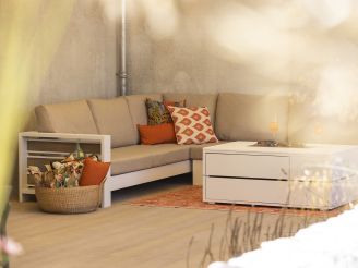 Teak inlay: De inlay van teak geeft de bank een natuurlijke look en is bestand tegen alle weersomstandigheden, zodat je er jarenlang van kunt genieten.