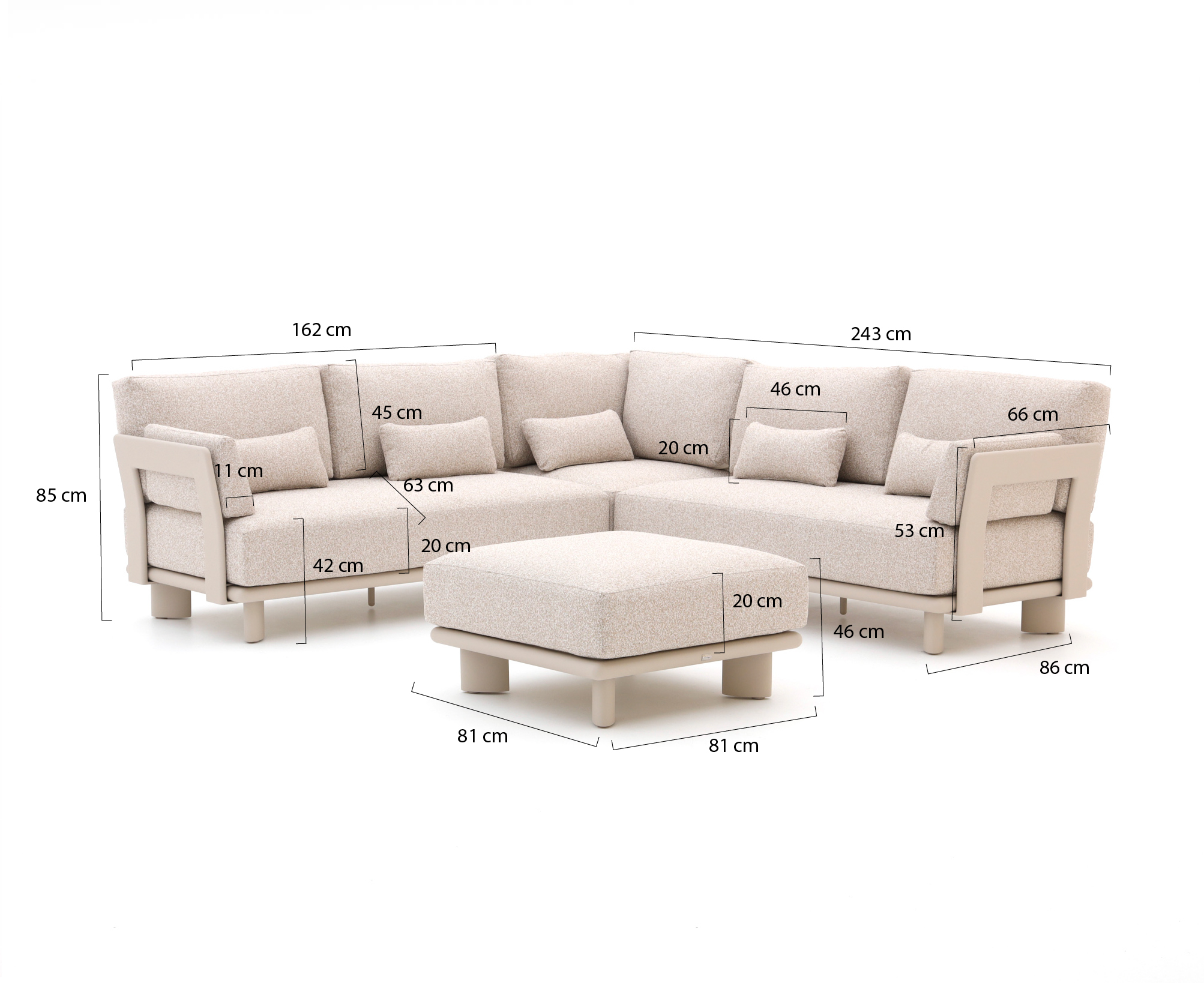 De Bellagio Battuello hoek loungeset is een compacte hoekset voor 5 personen, ideaal als je graag lang blijft hangen in de tuin met een klein gezelschap. Door de hoekopstelling benut je de ruimte op je terras efficiënt en heb je toch genoeg zitplekken. De set wordt geleverd inclusief kussens in een rustige camel zandkleur, zodat je in één keer klaar bent en niet zelf hoeft te zoeken naar passende kussens. De kussenhoezen zijn afritsbaar, waardoor je ze makkelijker schoon en fris houdt na een zomer vol koffie, wijn en misschien een ijsje dat niet helemaal goed ging.