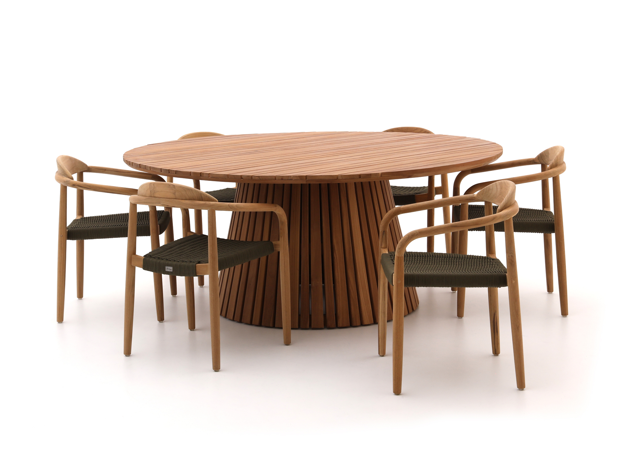 Als je van een natuurlijke uitstraling houdt, dan is deze Bellagio Berbaro/Santa Severina dining tuinset echt iets voor jou. Met zijn teakhouten tafel en stoelen met rope zitting in mosgroen, biedt deze set een warme en uitnodigende plek voor zes personen om samen te genieten. De ronde tafel van 180 cm zorgt voor een gezellige sfeer, terwijl de stoelen makkelijk stapelbaar zijn. Ideaal voor als je de boel even wilt opruimen of ruimte wilt maken voor een tuinfeestje.