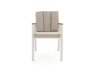 De Bellagio Bertinoro/Menzano dining tuinset is een ruime eetset voor 6 personen, ideaal als je graag buiten eet met familie of vrienden en je stoelen na gebruik wilt kunnen stapelen. De aluminium tafel en stoelen zijn licht van gewicht, dus je schuift de set makkelijk opzij als je je terras anders wilt indelen. De stoelen hebben een witecru kleur met leatherlook banden en teakhouten armleuningen, wat zacht aanvoelt en net wat meer comfort geeft tijdens een lange barbecue of spelletjesavond. De kussens zijn inbegrepen, zodat je direct goed zit zonder extra losse aankopen.