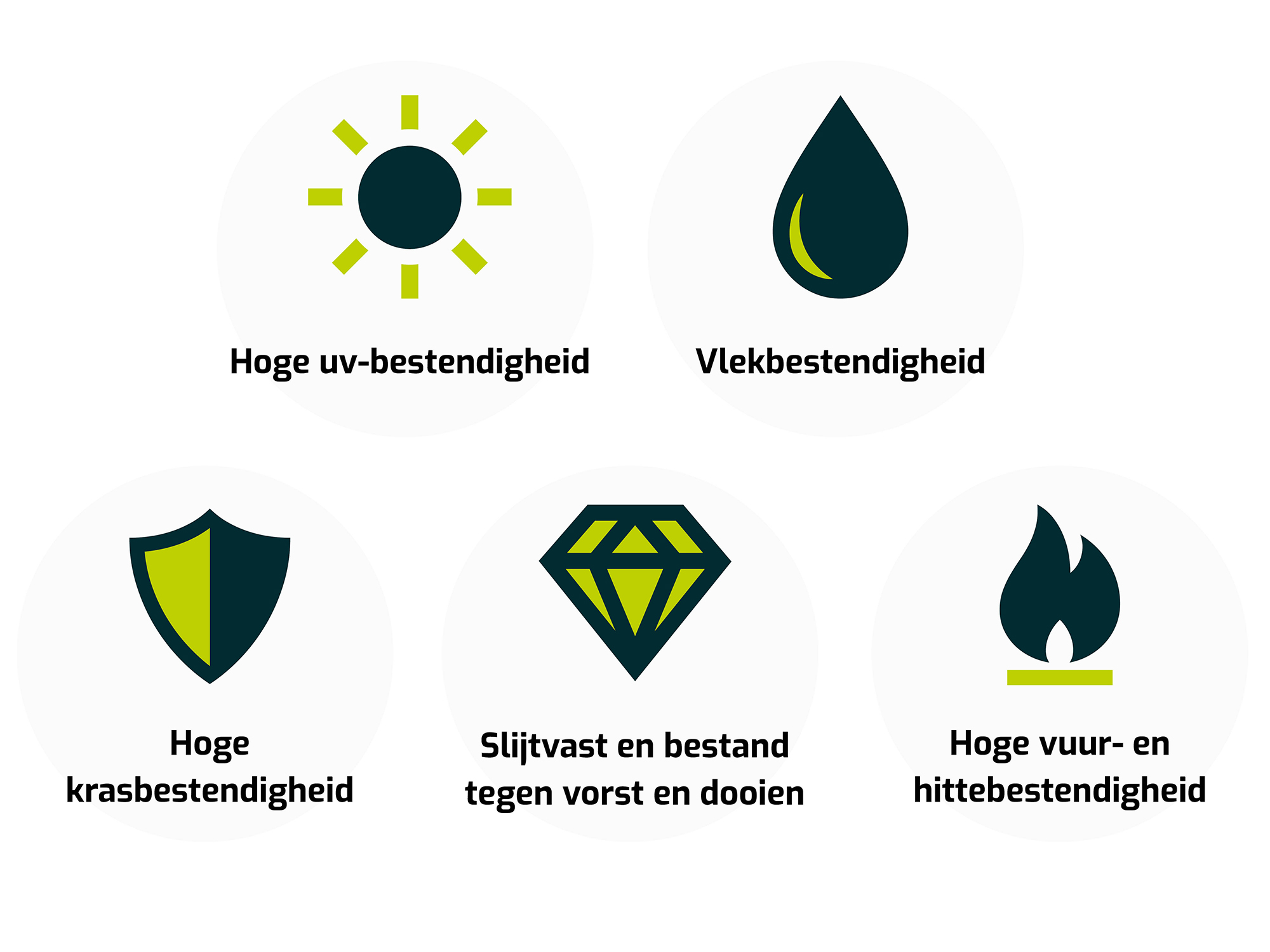 Dekton tafelblad: Het blad is vlekbestendig, waardoor vuil en vocht niet kunnen binnendringen. Daarnaast is het materiaal kleur- en hittebestendig, wat ervoor zorgt dat het er jarenlang als nieuw uitziet. Het is zwaar en sterk, ideaal voor buitengebruik.