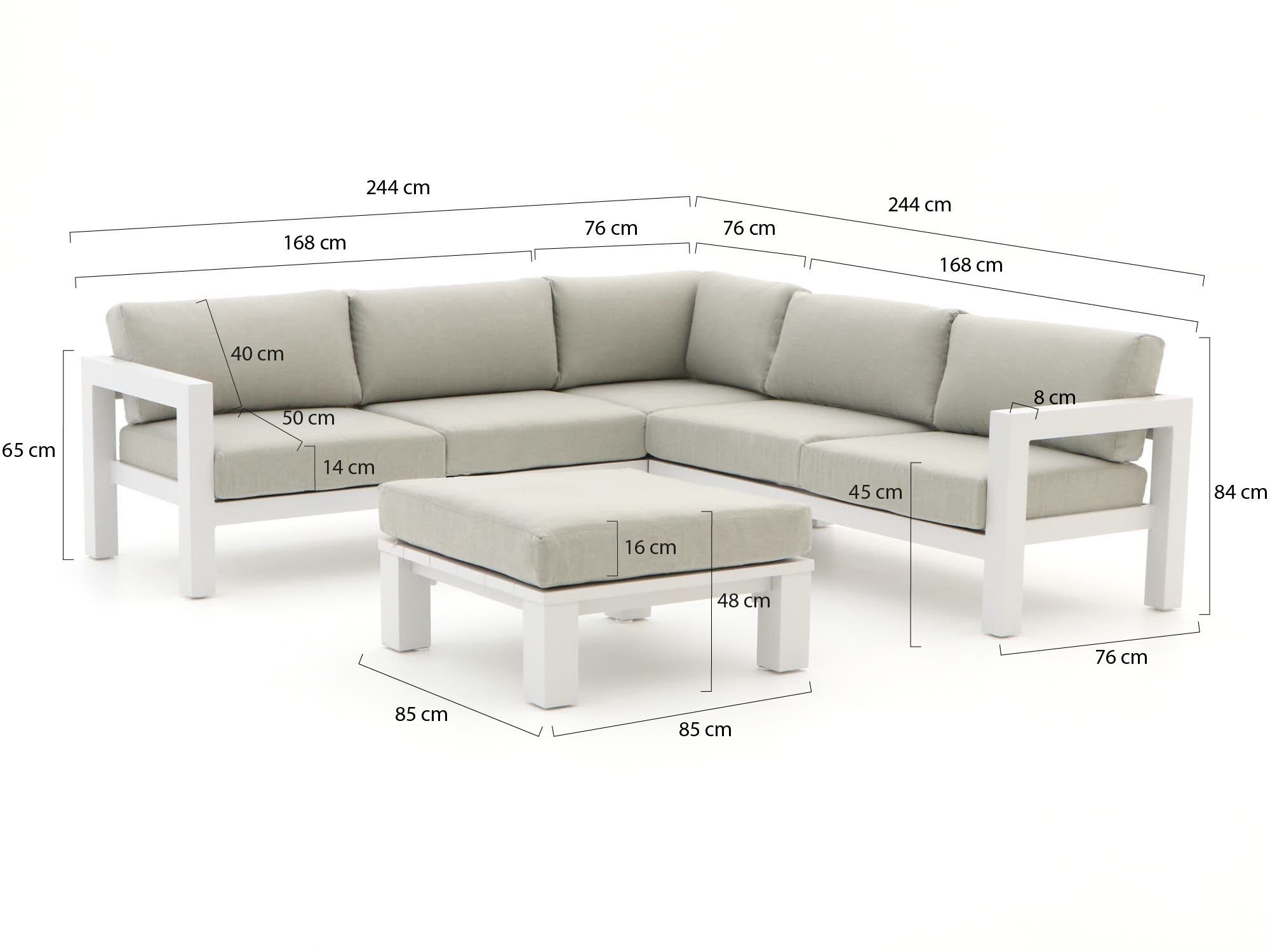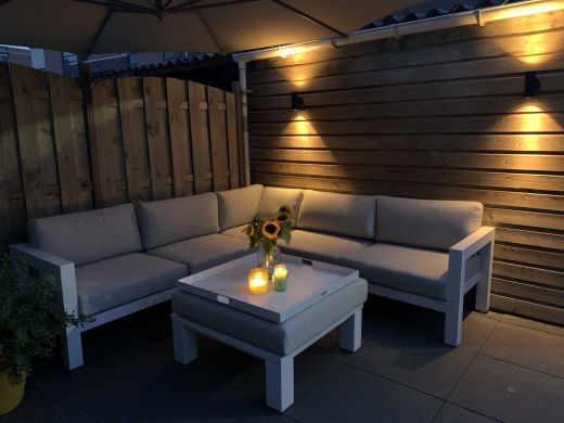 Hoekopstelling: Deze opstelling benut de ruimte efficiënt en biedt de mogelijkheid om zowel te zitten als languit te liggen. Perfect voor een relaxte middag in de zon.