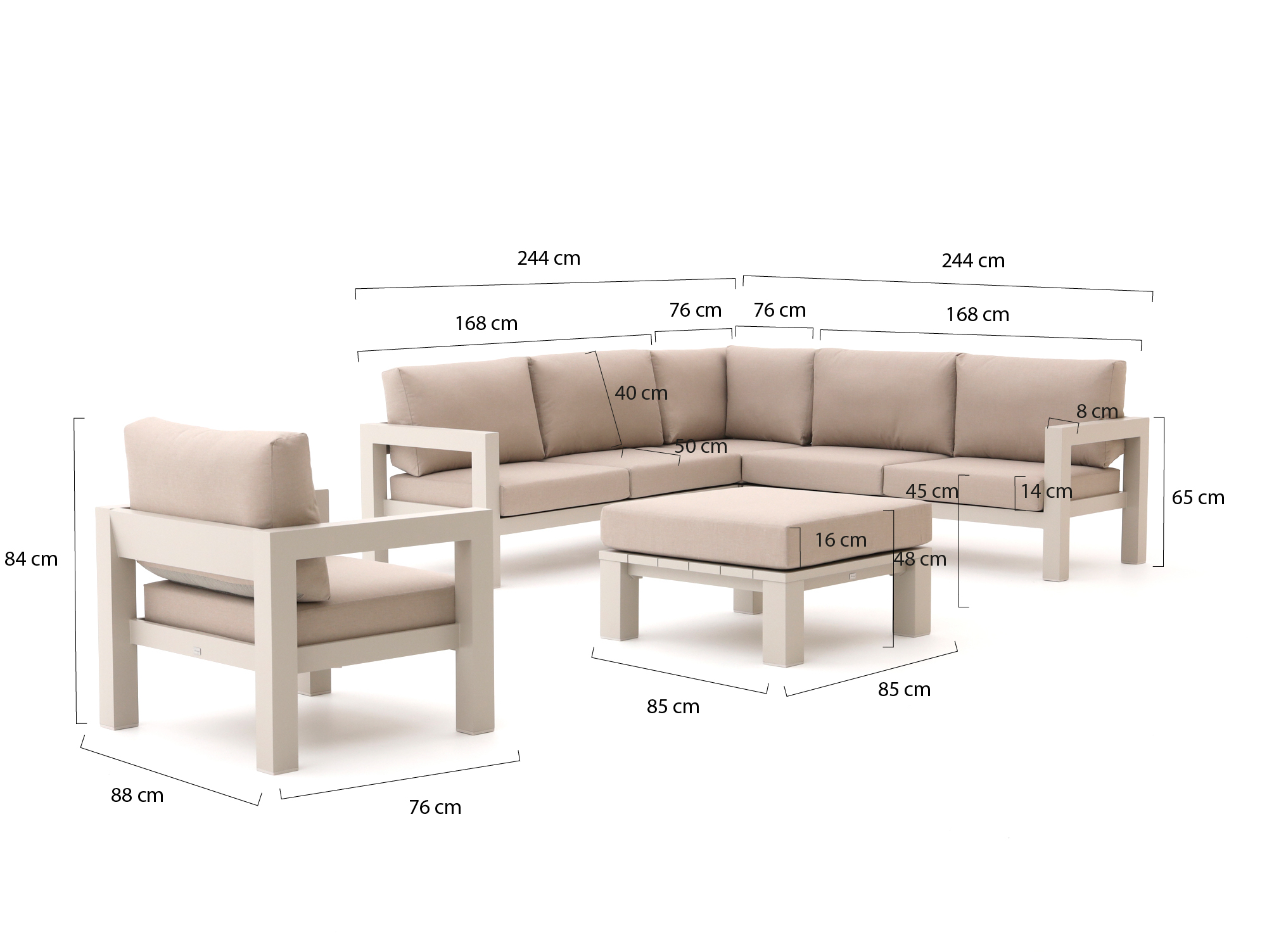 • Hoekopstelling 244 x 244 cm: Je schuift de set handig in een hoek, waardoor je de zitruimte maximaliseert en meer vrije ruimte overhoudt op je terras.