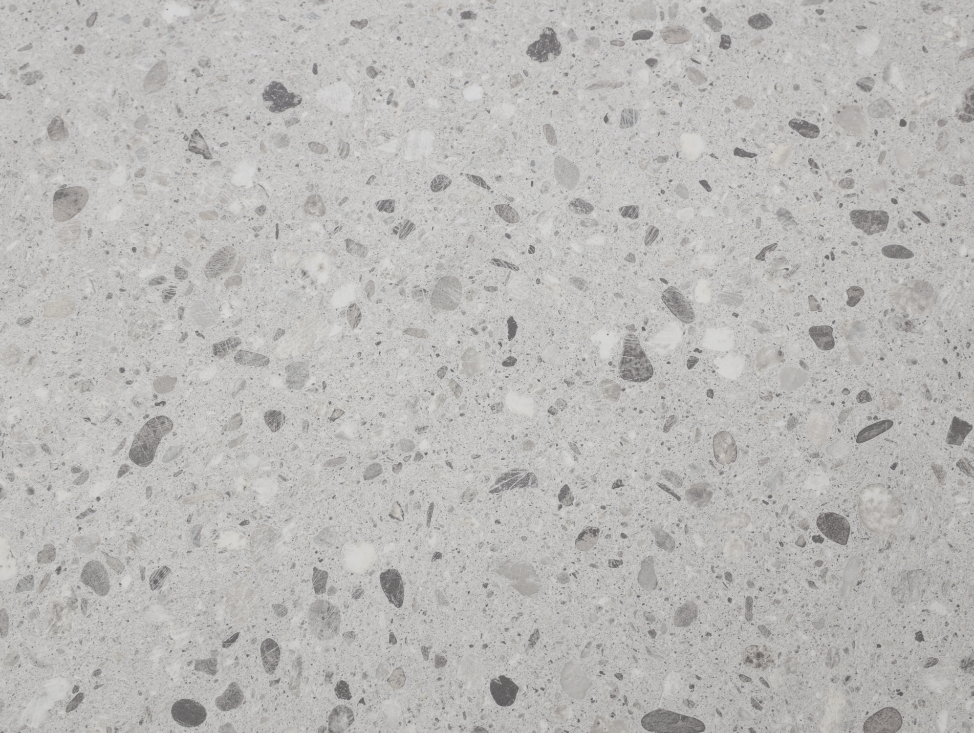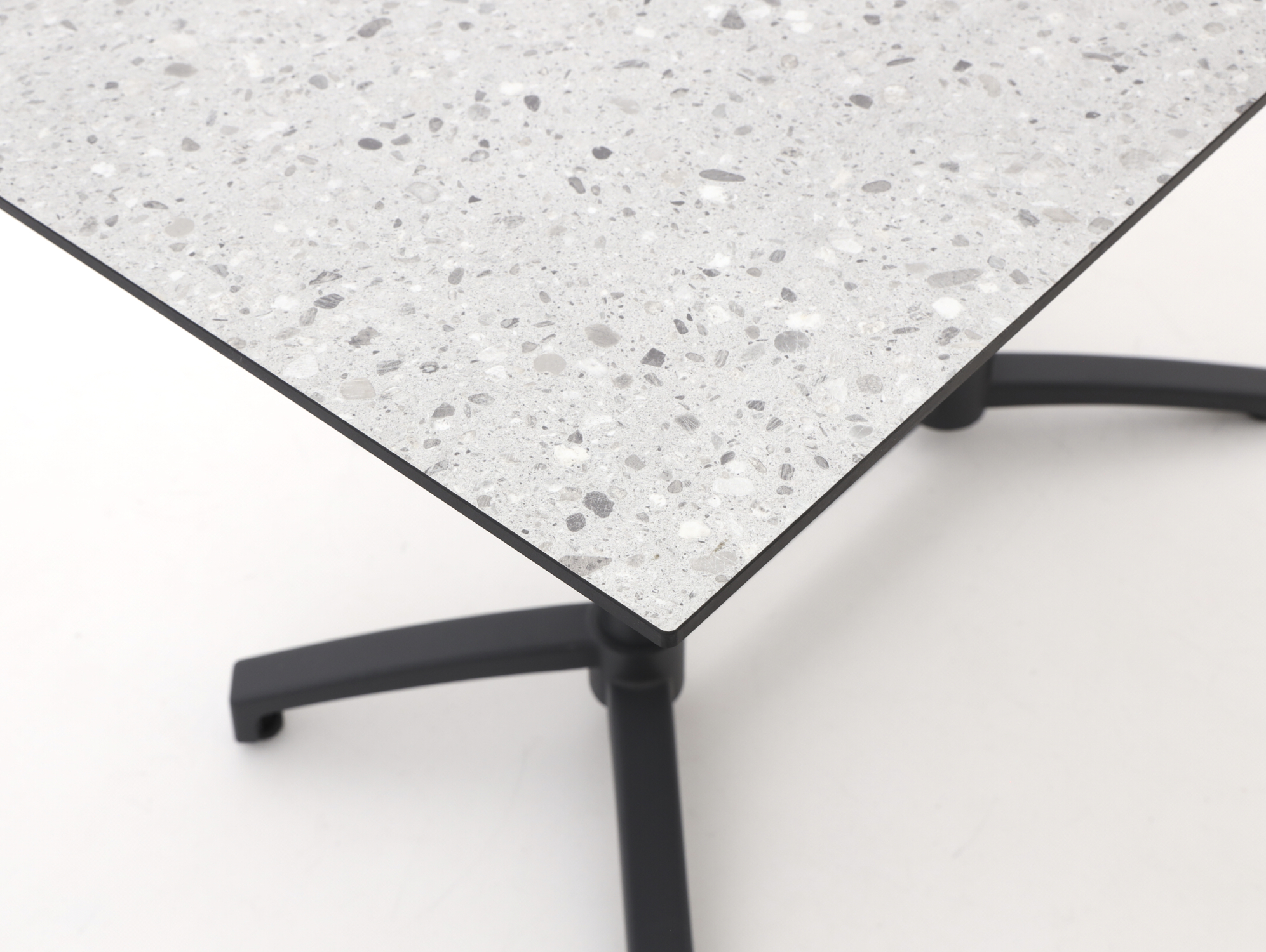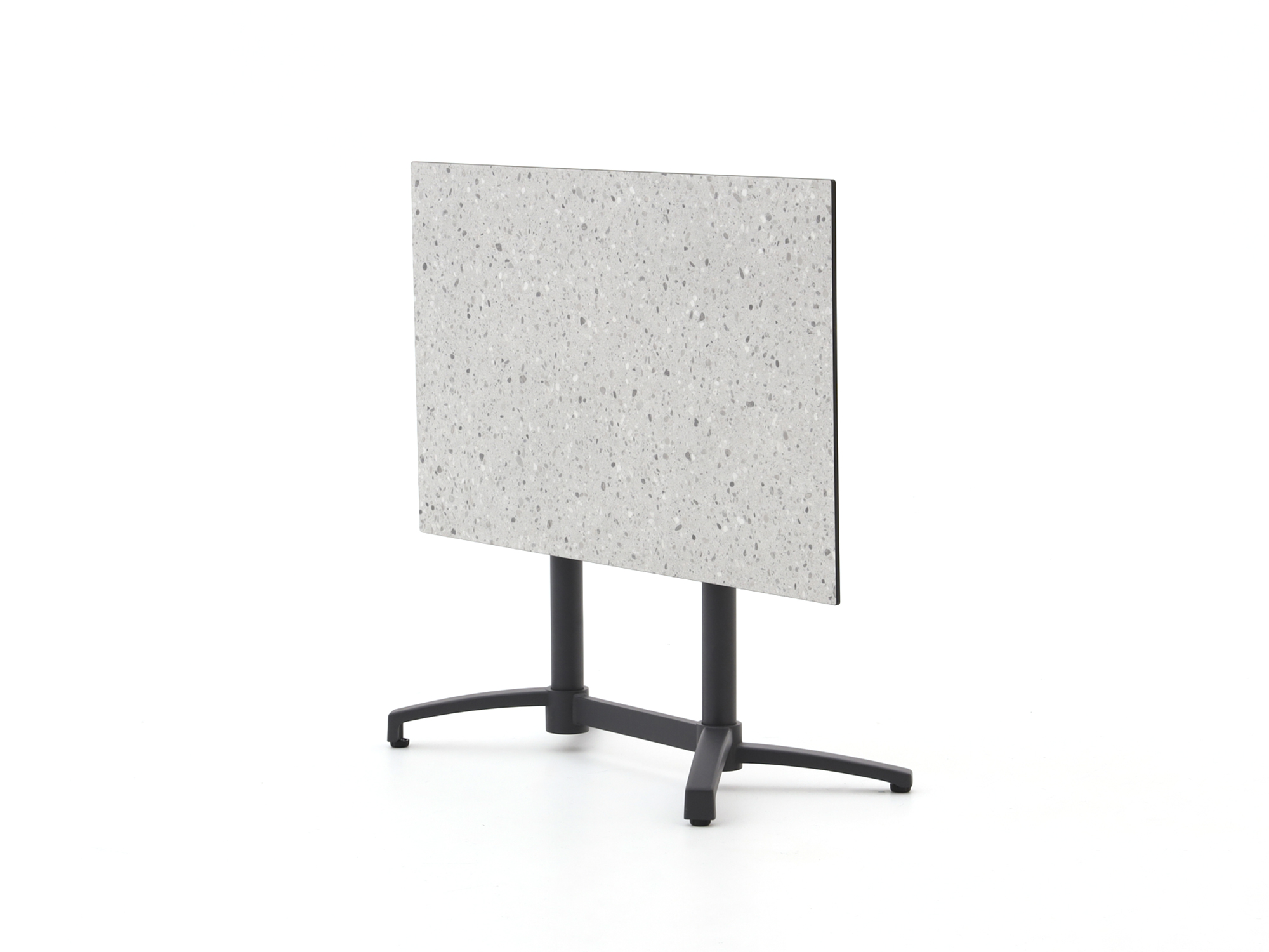 • Kunststof HPL tafelblad: Sterk en vlak blad in grijs steenlook waar borden en glazen stevig op staan.
