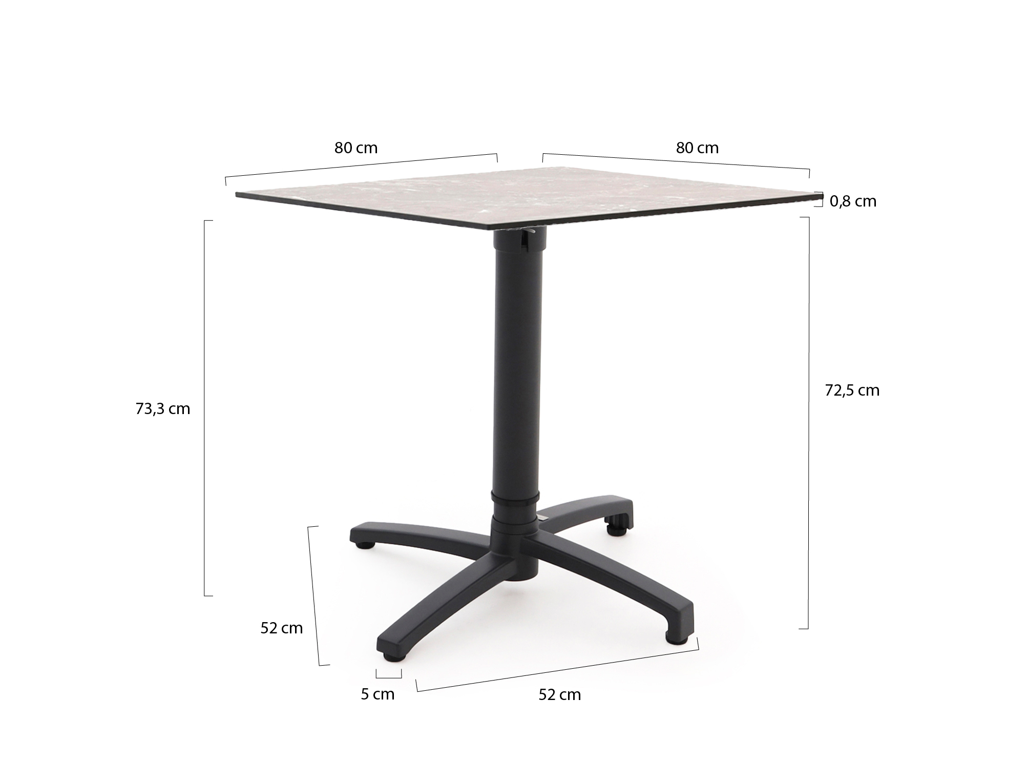 • Compact formaat 80x80 cm: Groot genoeg voor 2 tot 4 personen, maar klein genoeg voor een balkon of smal terras.