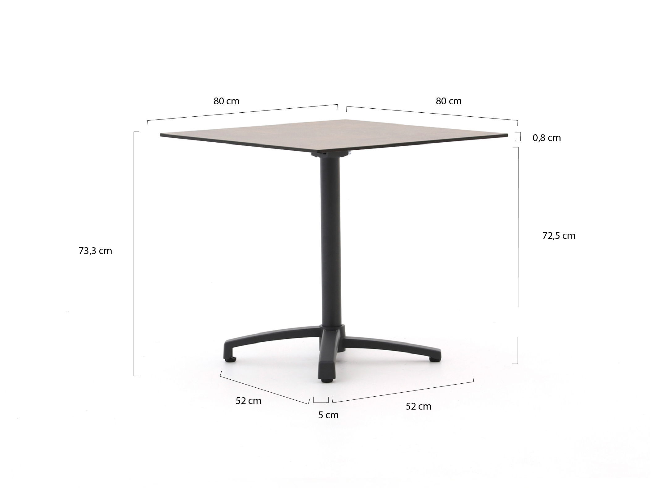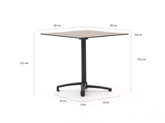 • 80x80 cm tafelblad: Groot genoeg voor 2 tot 4 personen, maar compact zodat hij ook op kleinere plekken past.