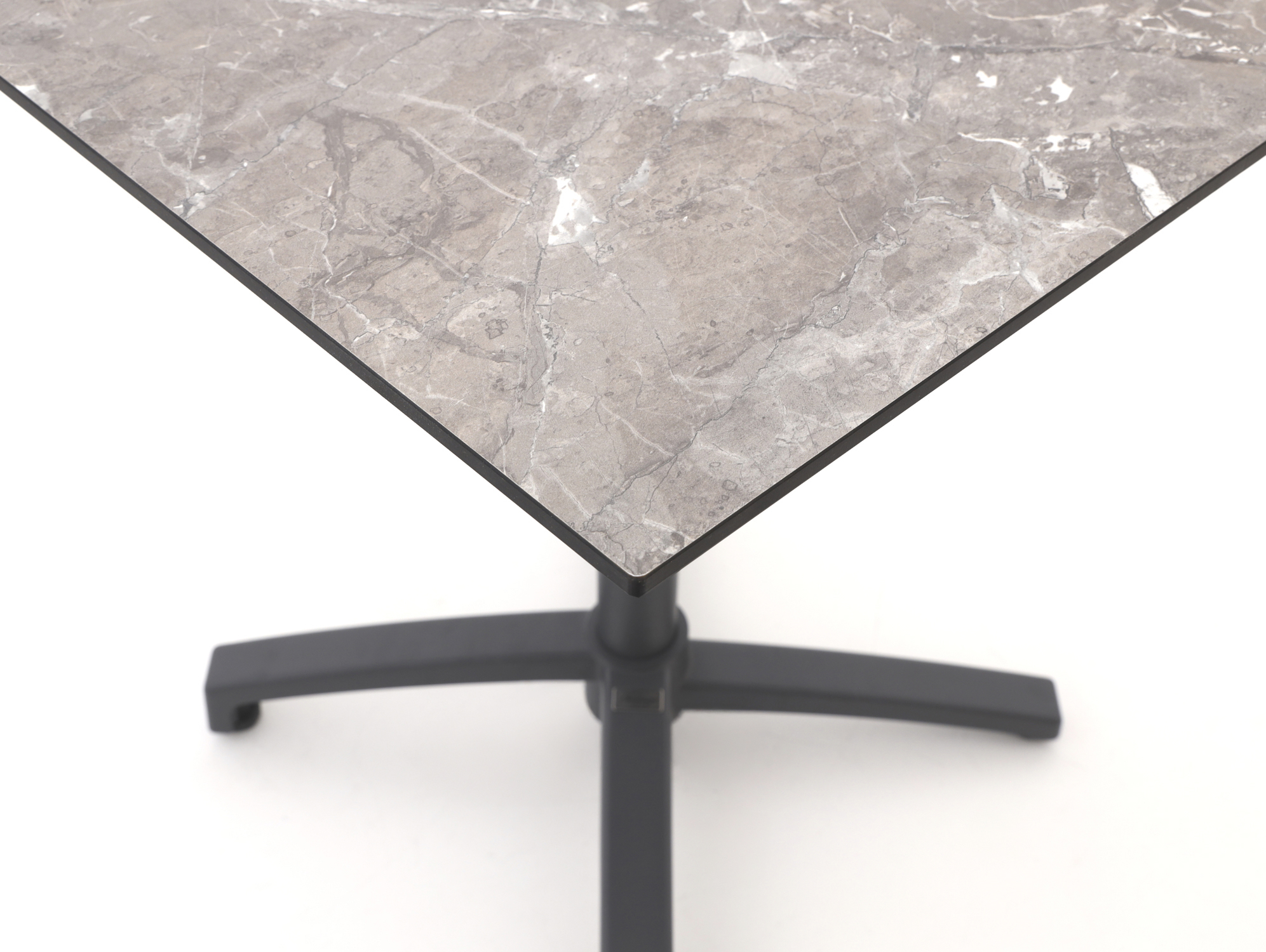 De Bellagio Canzo klaptafel 80x80cm is een compacte tuintafel voor 2 tot 4 personen, ideaal als je niet veel ruimte hebt maar wel lekker buiten wilt eten of borrelen. Door het handige klapsysteem klap je het blad eenvoudig omhoog en zet je de tafel smal tegen de muur, bijvoorbeeld op je balkon. Het grijze kunststof HPL blad is stevig en onderhoudsvriendelijk, dus je zet er zonder gedoe borden, glazen en een pan met eten op. Het aluminium onderstel in grijs is licht van gewicht, waardoor je de tafel makkelijk even verplaatst als je liever in de zon of juist in de schaduw zit.