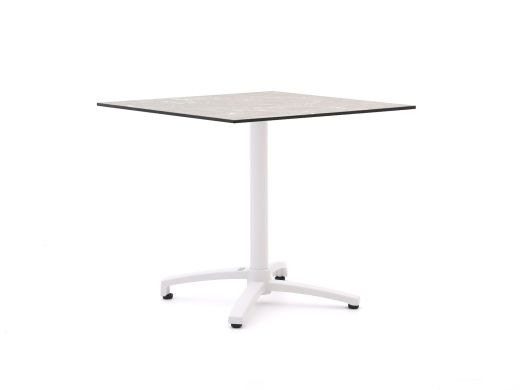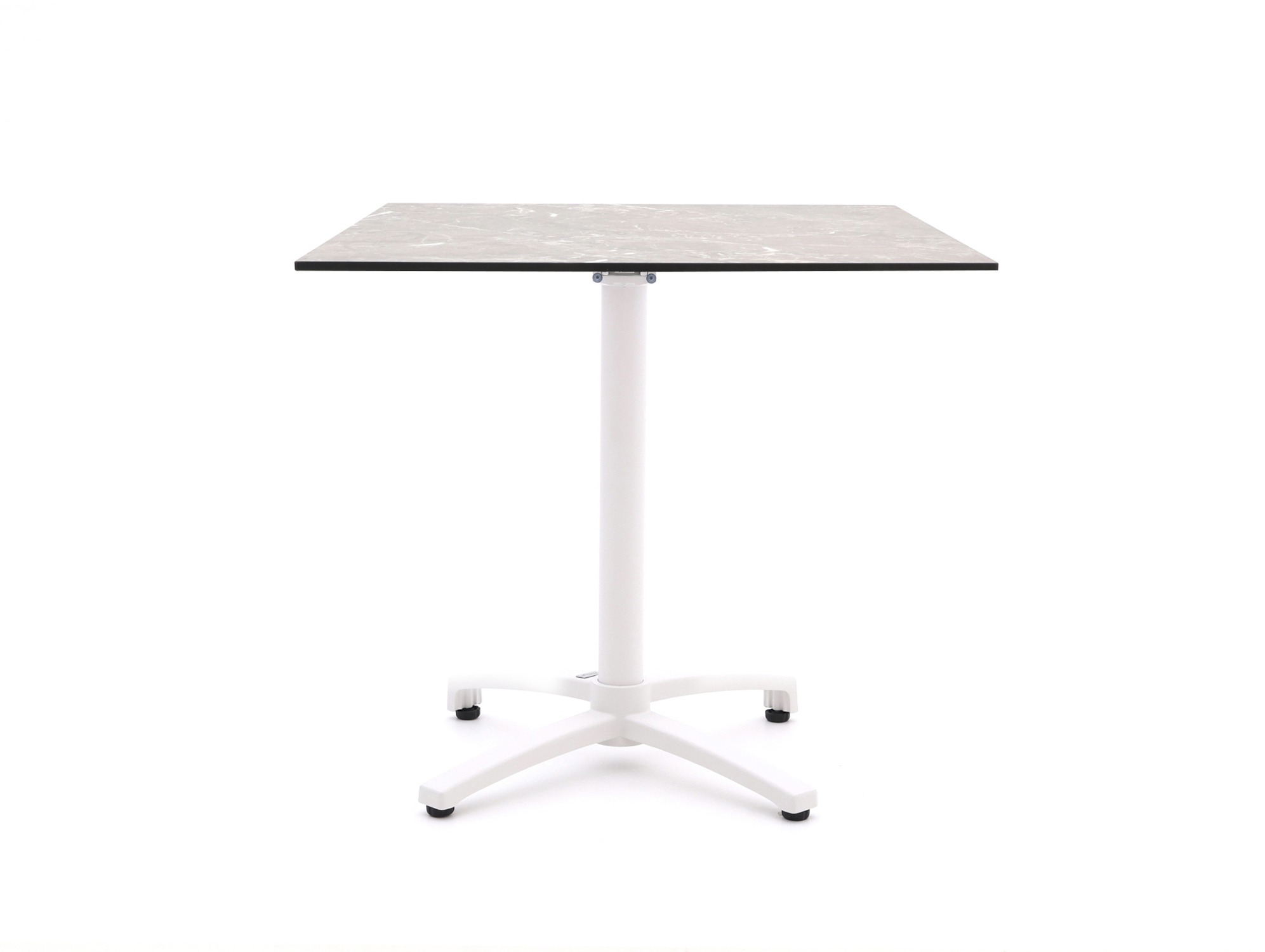 De Bellagio Canzo klaptafel 80x80x73cm is een compacte, vierkante tuintafel die je makkelijk inklapt en opbergt. Handig als je een kleiner terras of balkon hebt, of als je af en toe extra tafelruimte wilt bij het eten of borrelen. Het aluminium onderstel in het wit is licht van gewicht, waardoor je de tafel zo even verplaatst als je je zithoek anders wilt neerzetten. Het kunststof HPL tafelblad in een grijze kleur is stevig en onderhoudsvriendelijk, je zet er zonder gedoe borden, glazen en schalen op. Door het formaat van 80x80 cm heb je genoeg ruimte voor 2 tot 4 personen, afhankelijk van de stoelen die je erbij zet en hoeveel je op tafel wilt kwijt kunnen.