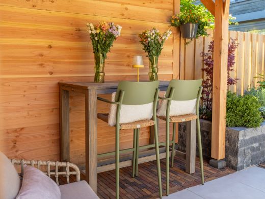 De smalle barkrukken nemen minder ruimte in en passen makkelijk op je terras