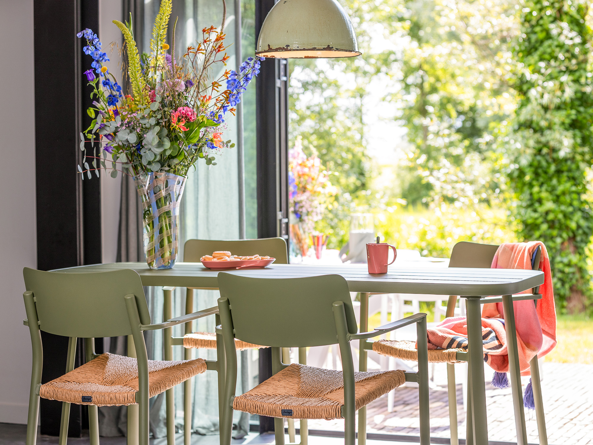 • Moss green kleur: De groene kleur geeft wat meer sfeer, maar blijft neutraal genoeg om met veel stoelen te combineren.