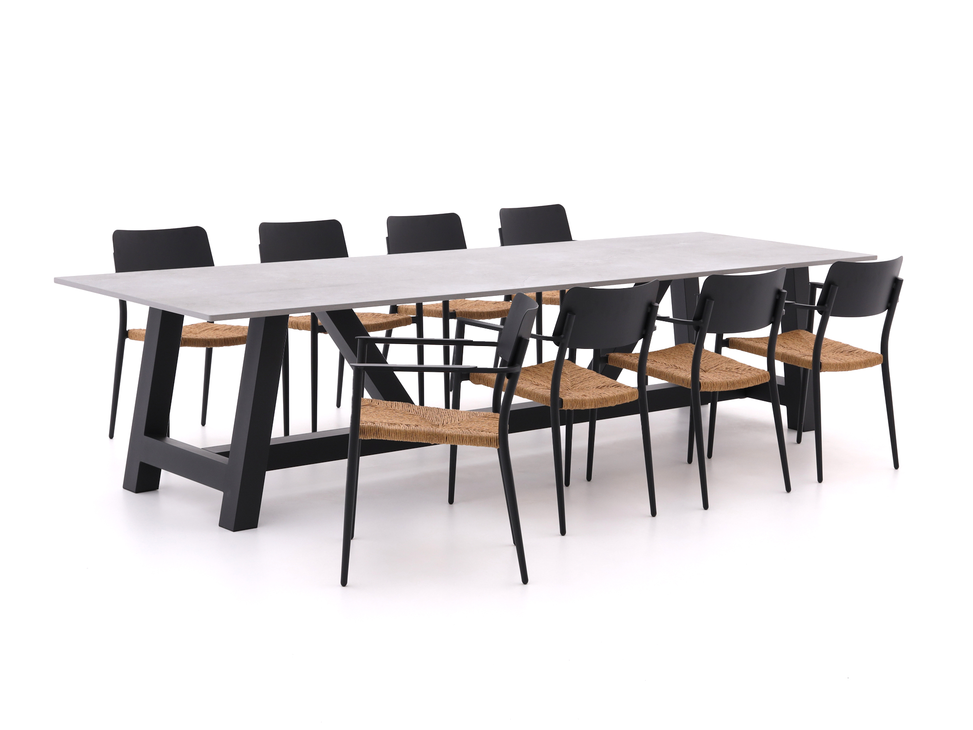 De Bellagio Cino/Bresimo 317cm dining tuinset 9-delig stapelbaar is een echte eyecatcher! De royale tafel nodigt uit om avonden lang gezellig te dineren. Deze trendy set bestaat uit 8 aluminium tuinstoelen en een 317cm lange tafel met dekton blad. Elk tafelblad van dekton heeft een unieke tekening.