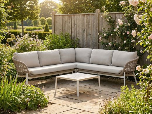 De Bellagio Cupello hoek loungeset is een ruime aluminium loungeset voor 5 personen, ideaal als je graag lang natafelt of gewoon wilt uitrekken met een goed boek. De set is uitgevoerd in wit met bijpassende kussens, wat je terras rustig en licht laat ogen zonder dat je er veel naar om hoeft te kijken. Dankzij het extra dikke aluminium frame blijft de set stevig staan, ook als iedereen tegelijk neerploft. De afritsbare kussenhoezen was je gewoon in de wasmachine, dus een glas drinken dat omgaat is geen ramp maar hooguit een wasje. Door de hoekopstelling gebruik je de ruimte in je tuin efficiënt en creëer je snel een gezellige zithoek.