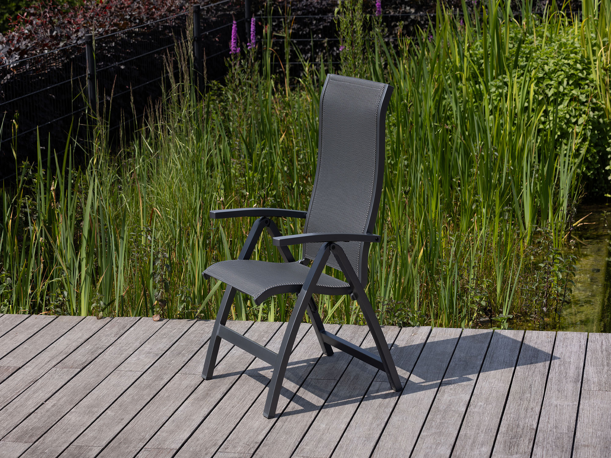 De Bellagio Fermo standenstoel in een stijlvolle grijze tint is een aanwinst voor elke tuin. Deze stoel combineert comfort met flexibiliteit dankzij de verstelbare rugleuning die je in maar liefst zeven verschillende standen kunt zetten. Het aluminium frame is niet alleen licht van gewicht, maar ook onderhoudsarm en roestvrij, waardoor je er jarenlang plezier van hebt. De zitting van textileen vormt zich naar je lichaam, wat zorgt voor een aangename zitervaring, zelfs tijdens lange zomeravonden aan de tuintafel. En als je hem even niet nodig hebt? Dan klap je hem eenvoudig in en berg je hem zo weer op. Met de Bellagio Fermo is het alsof je een persoonlijke butler hebt die altijd klaarstaat voor jouw comfort, zonder dat je hem ooit hoeft te tippen!