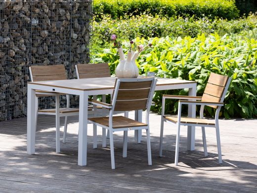 Neutrale tinten: De witte en ecru kleuren passen in vrijwel elke tuinsetting, waardoor de set een tijdloze uitstraling heeft.