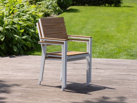 De Bellagio Fidenza dining tuinstoel is een stijlvolle aanvulling voor elke tuinset. Met zijn strakke witte kleur en natuurlijke houtlook van polywood, biedt deze stoel een moderne uitstraling zonder in te boeten op functionaliteit. Het aluminium frame is licht van gewicht en onderhoudsarm, waardoor je meer tijd hebt om te genieten van je buitenruimte. De stoel is bovendien stapelbaar, wat hem ideaal maakt voor het besparen van ruimte wanneer hij niet in gebruik is. En zeg nou zelf, wie wil er nou geen stoel die net zo goed stapelt als hij eruitziet?