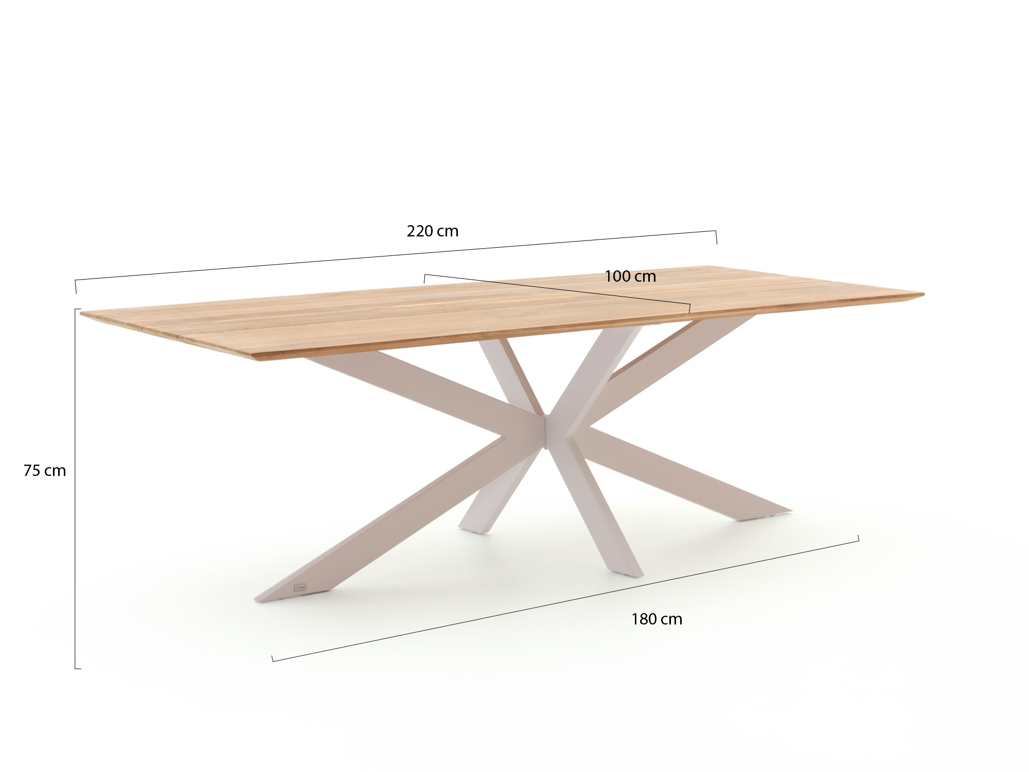 • Afmeting 220x100 cm: Lange, rechthoekige tafel waar je stoelen makkelijk langs de lange kanten kwijt kunt, zonder dat het krap wordt.