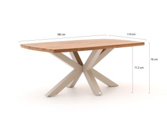 De Bellagio Induno Deens ovaal dining tuintafel is een stevige eettafel voor wie graag lang tafelt met 4 tot 6 personen en houdt van een rustige, natuurlijke look in de tuin. Het teakhouten blad (natural teak) geeft elke stoel direct wat warmte en sfeer, terwijl het aluminium onderstel in gebroken wit de tafel licht van gewicht houdt. Hierdoor kun je de tafel nog redelijk makkelijk verplaatsen als je terras anders moet worden ingedeeld. Met 180x110 cm heb je genoeg ruimte voor borden, schalen en een kan drinken, zonder dat de tafel meteen je hele terras vult. Het teakhout kun je laten vergrijzen voor een natuurlijke, stoere look, of met een kleur beschermer mooi bijhouden als je de warme kleur liever langer bewaart.