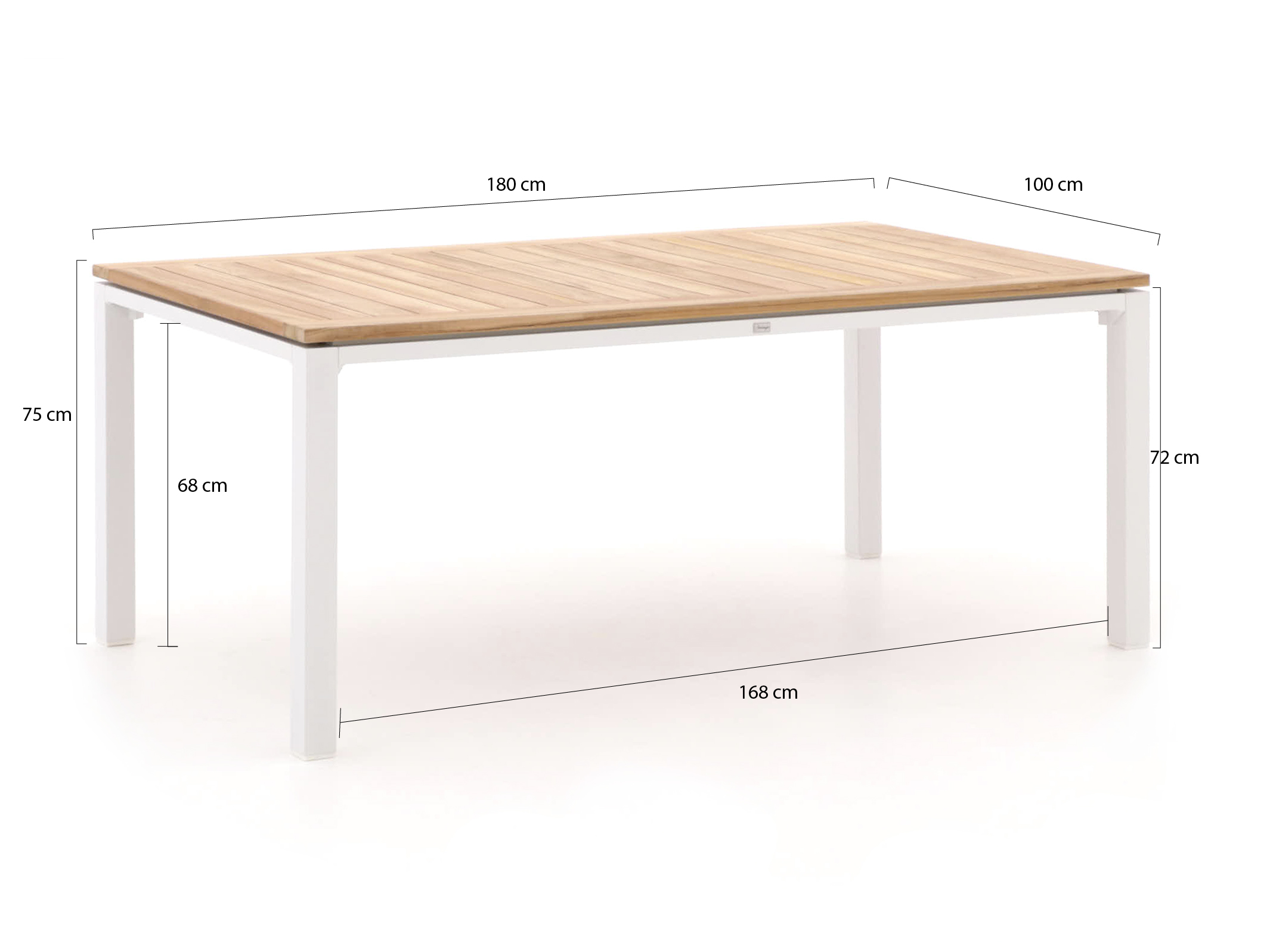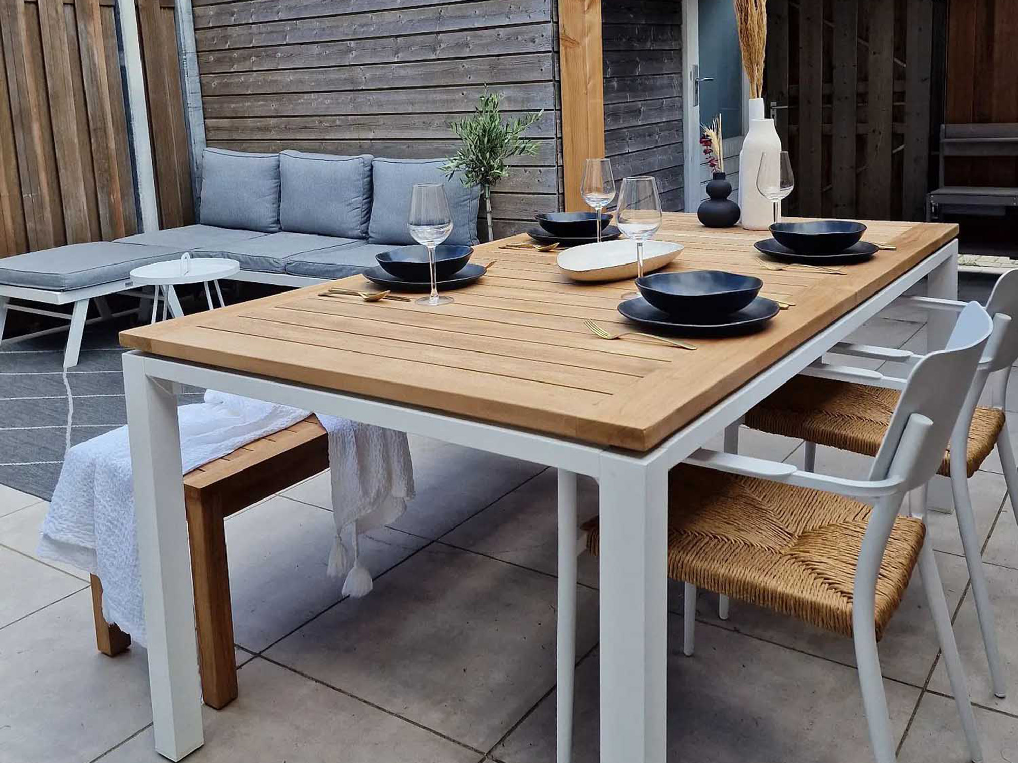 • Teakhouten tafelblad: Dit natuurlijke materiaal is bestand tegen alle weersomstandigheden en zorgt voor een warme, uitnodigende uitstraling.