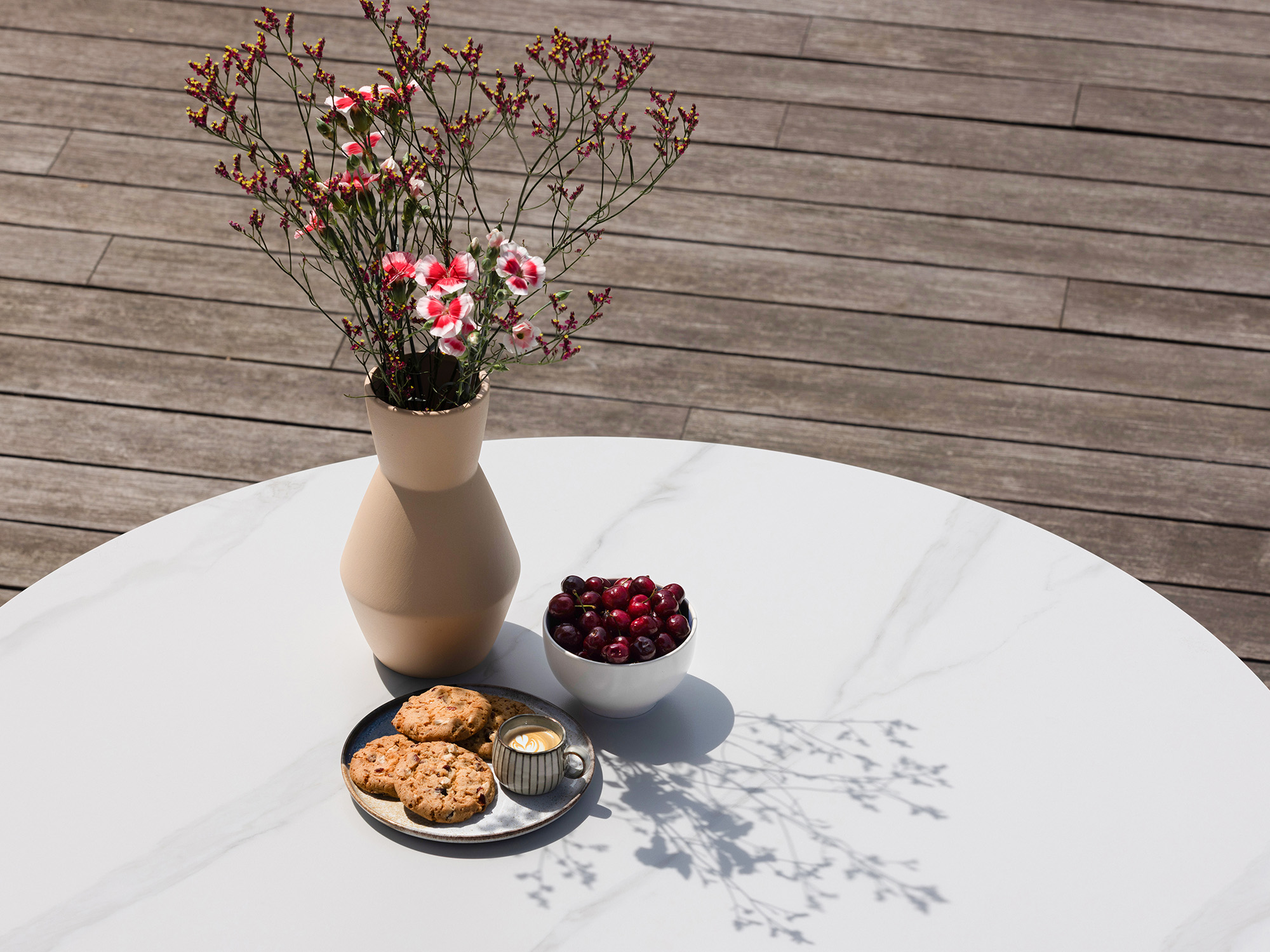 Sintered Stone tafelblad: Dit materiaal is onderhoudsarm en sterk, waardoor vlekken van eten en drinken er niet snel in trekken. Perfect voor een zorgeloze maaltijd in de tuin!