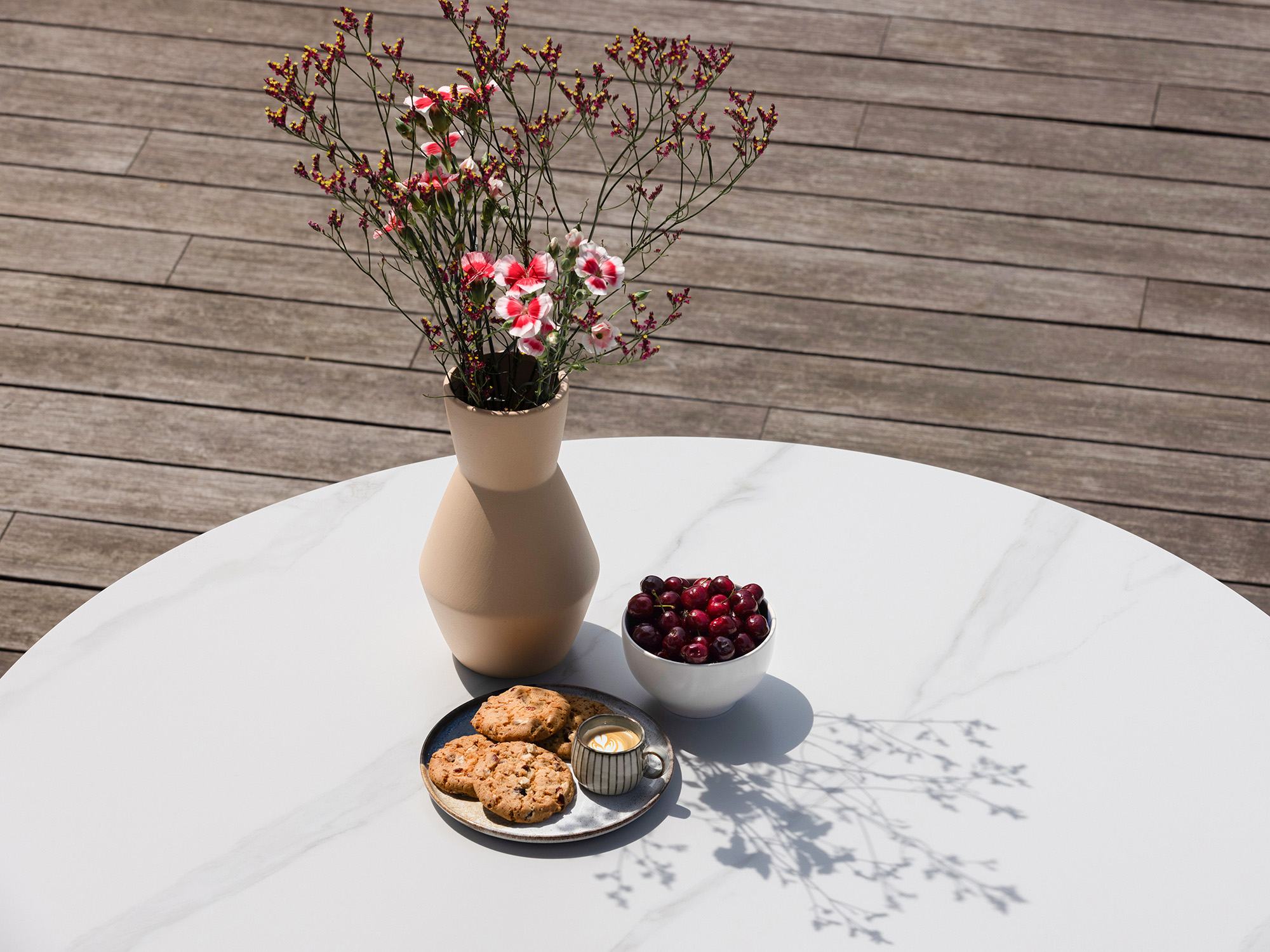 De Bellagio Lodola dining tuintafel is een ronde tuintafel voor 4 personen, ideaal als je graag buiten eet of borrelt in een gezellige setting. Het witte sintered stone tafelblad is sterk en krasbestendig, dus je zet zonder stress borden, pannen en schalen neer. Het aluminium onderstel in beige is licht van gewicht en kan niet roesten, zodat je de tafel makkelijk verschuift als je terras anders ingedeeld moet worden. Met een diameter van 130 cm heb je genoeg ruimte voor vier stoelen, zonder dat de tafel je hele terras overneemt. Zet de tafel wel op een vlakke ondergrond, dan staat hij het meest stabiel en hoef je niet met een wiebelende wijnglasrand te leven.