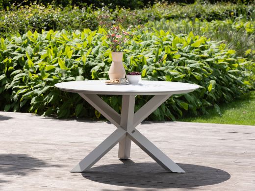De Bellagio Lodola dining tuintafel is een prachtige ronde tafel die jouw tuin meteen een stijlvolle uitstraling geeft. Het tafelblad van sintered stone in de kleur Mountain White is niet alleen een lust voor het oog, maar ook onderhoudsarm en sterk. Het aluminium onderstel zorgt ervoor dat de tafel licht van gewicht is en niet kan roesten, ideaal voor buitengebruik! Met een diameter van 130 cm biedt deze tafel comfortabel plaats aan vier personen, perfect voor gezellige etentjes in de open lucht. Zet je zonnebril op en geniet van een heerlijke maaltijd aan deze prachtige tafel!