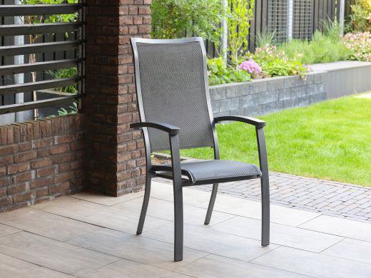 Aluminium frame: Dit materiaal kan niet doorroesten en is onderhoudsarm. Bovendien is het licht van gewicht, zodat je de stoel makkelijk kunt verplaatsen.