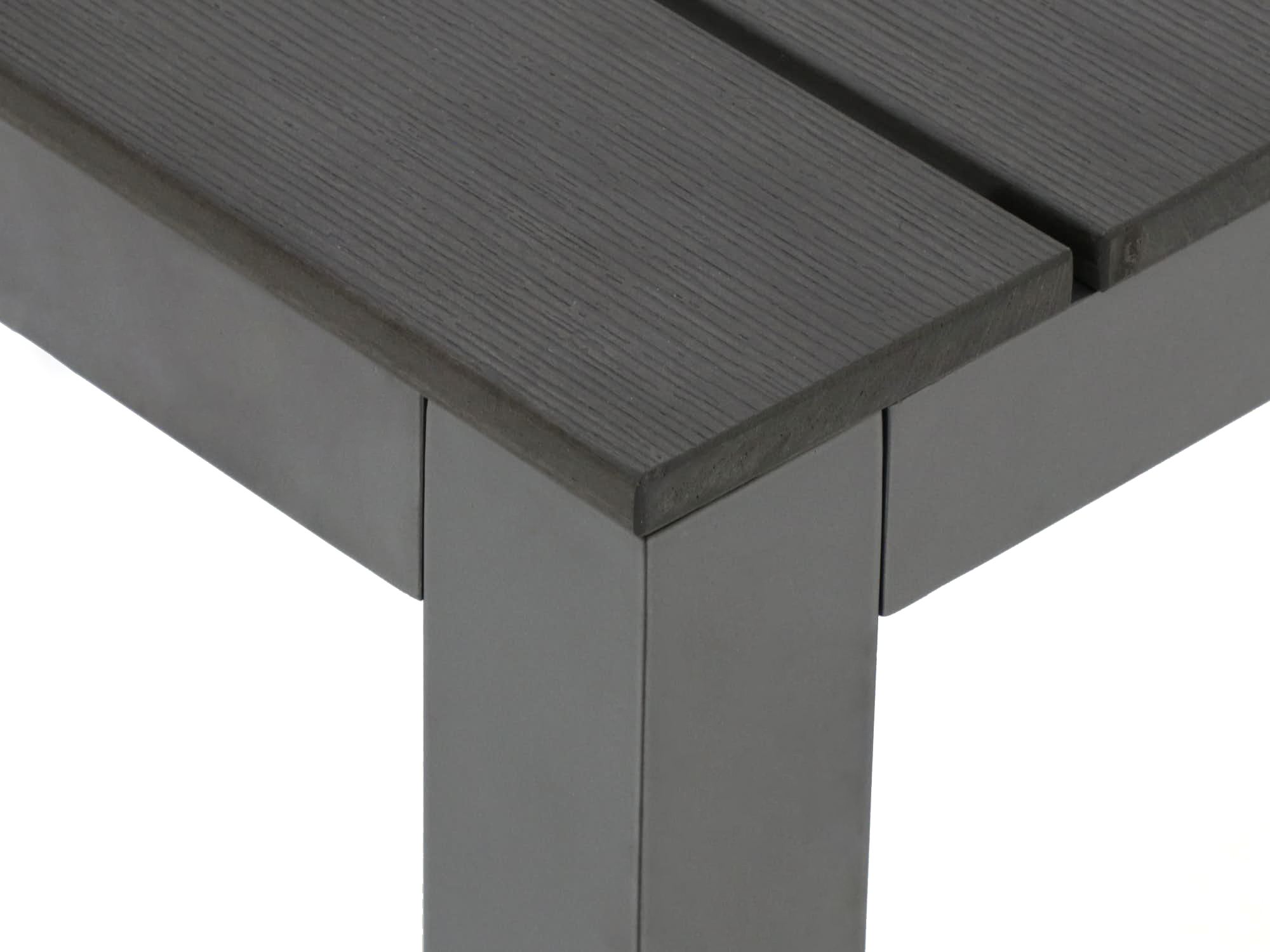 Polywood tafelblad: Ziet eruit als hout, maar is gemaakt van kunststof. Dat betekent water- en vuilafstotend en geen gedoe met kromtrekken.