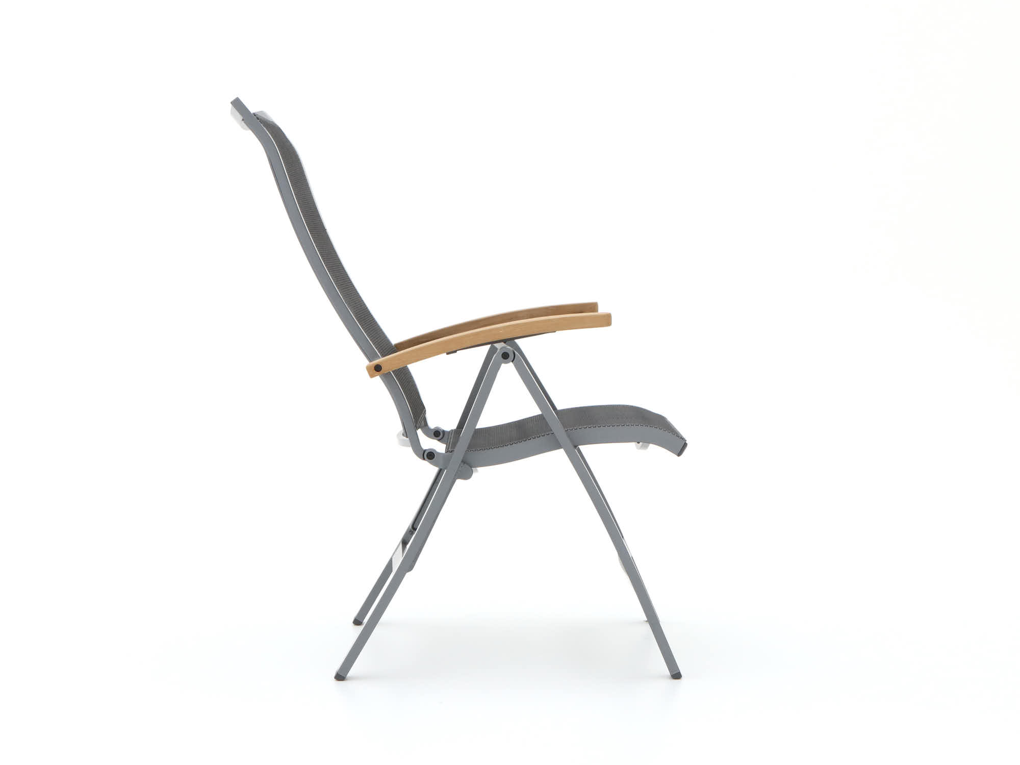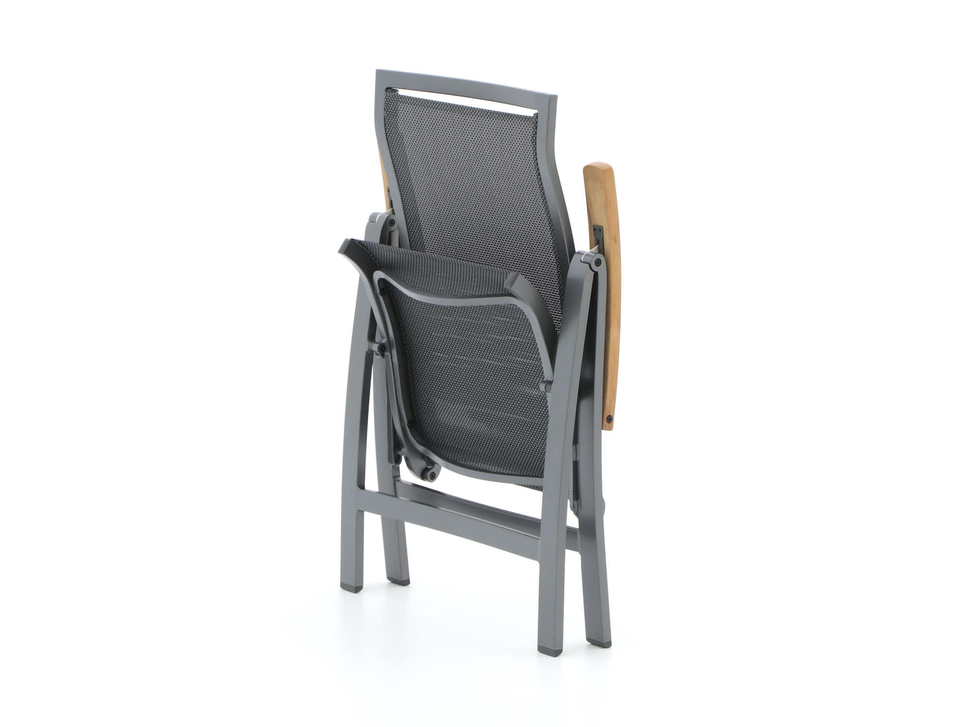 Textileen zitting en rug: Dit materiaal veert mee met je lichaam en ademt, dus het zit prettig als het warm is. Na een buitje droogt het snel weer op, wel zo fijn als je spontaan wilt aanschuiven.