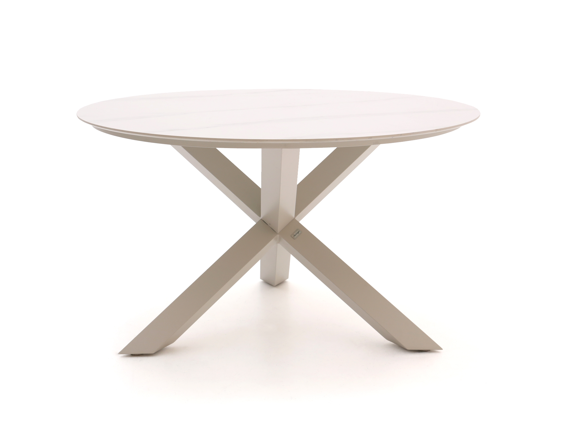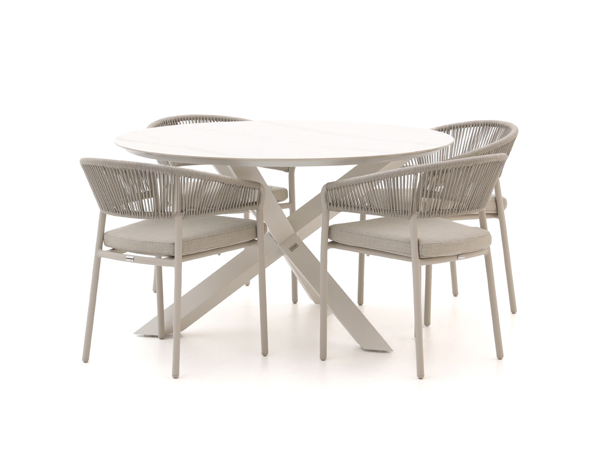 Deze Bellagio Nova Siri/Lodola dining tuinset is een fijne plek om met vier personen te genieten van een maaltijd in de buitenlucht. De set heeft een ronde tafel met een diameter van 130 cm en een wit sintered stone tafelblad, wat niet alleen mooi oogt, maar ook praktisch is. De stoelen zijn uitgevoerd in een taupe kleur en gemaakt van aluminium, waardoor ze licht en onderhoudsarm zijn. En als je de stoelen even niet nodig hebt, stapel je ze gewoon op. Handig toch?