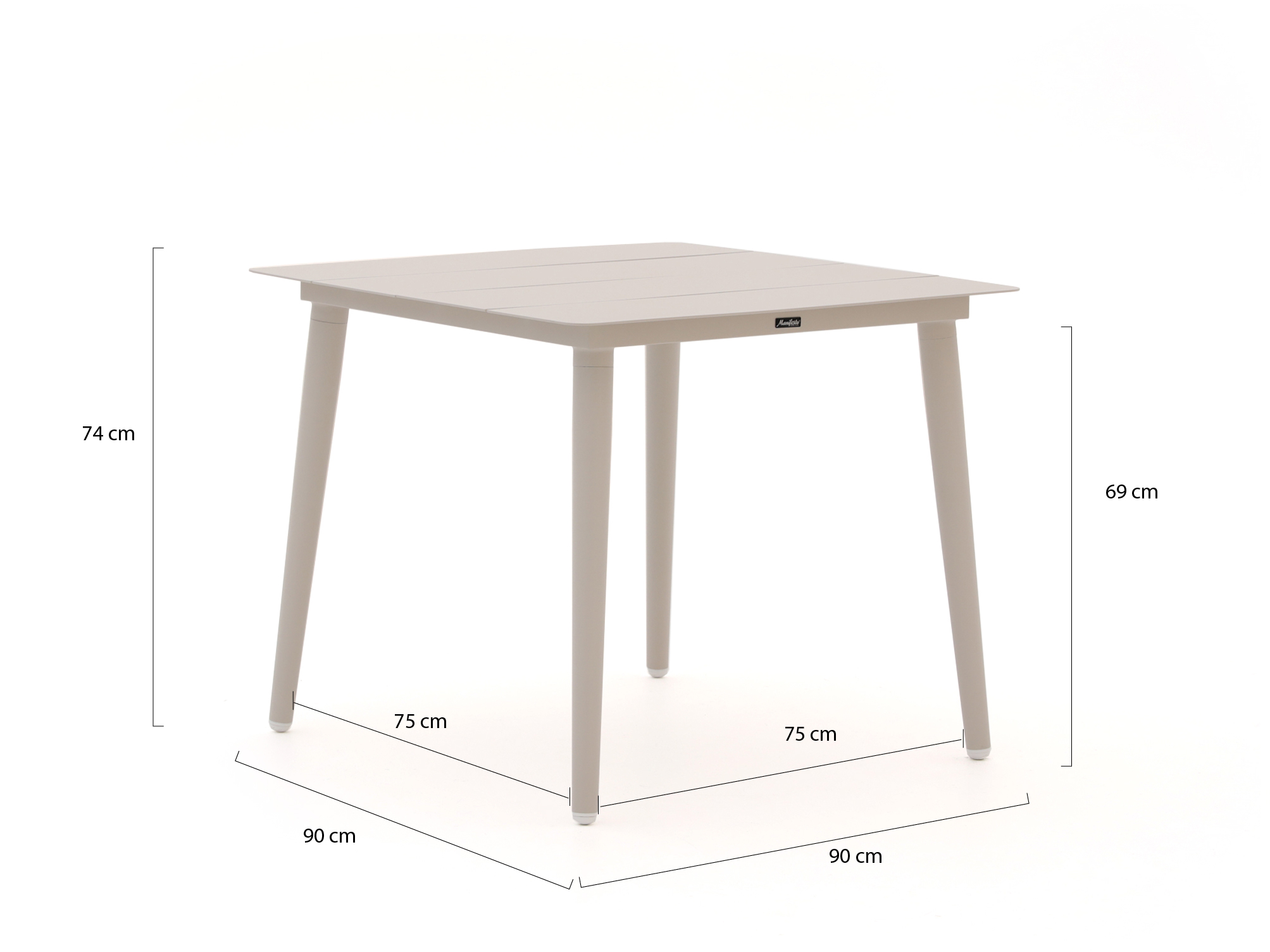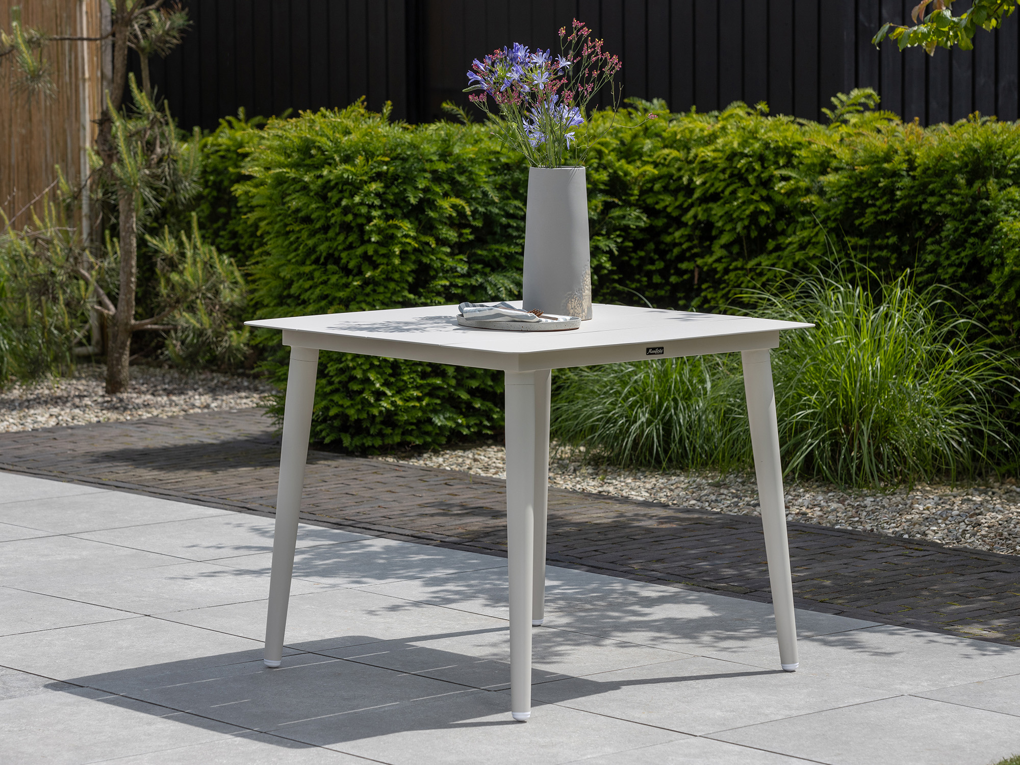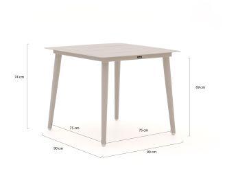 • Vierkante tafel van 90 cm: Je hebt genoeg ruimte voor 4 borden en schalen, maar de set neemt zelf niet je hele terras over.