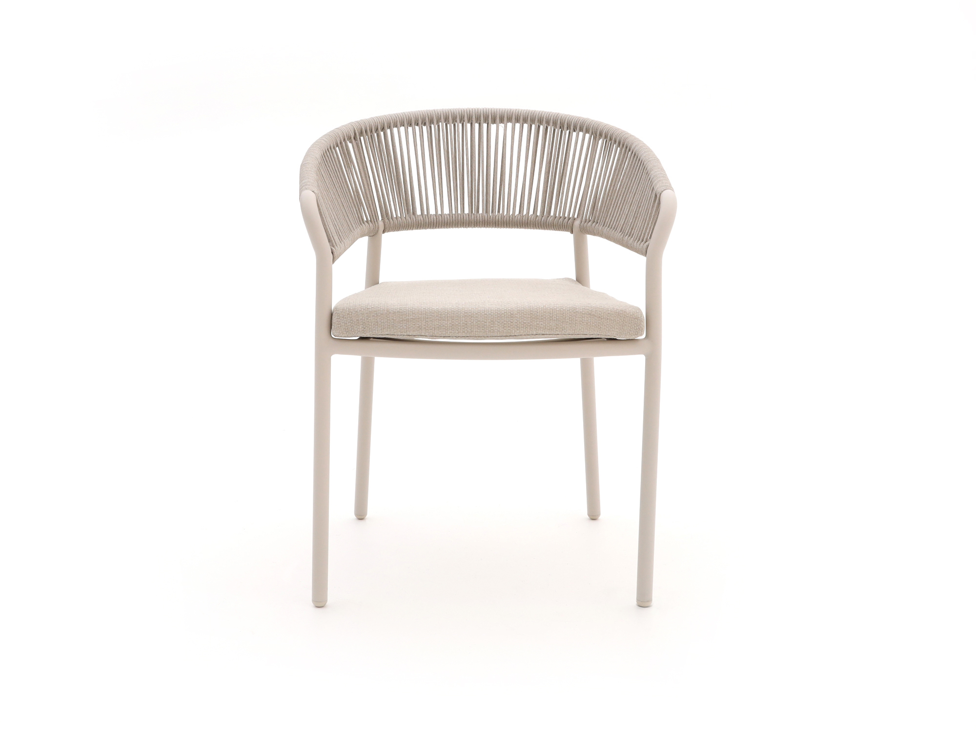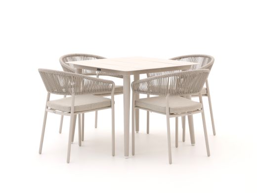 De Bellagio Nova Siri/Sora dining tuinset is een compacte aluminium set voor 4 personen, ideaal als je een kleiner terras of balkon hebt maar toch fijn buiten wilt eten. De vierkante tafel van 90 cm past makkelijk op een beperkte ruimte, terwijl je nog prima borden, glazen en schalen kwijt kunt. De set is volledig van lichtgewicht aluminium in beige tinten, waardoor je alles makkelijk verplaatst en weinig onderhoud hebt. De stoelen zijn stapelbaar, dus ben je klaar met het seizoen, dan schuif je de set zo aan de kant. Zoek je een praktische, nuchtere set om gewoon lekker aan te ontbijten, borrelen of avondeten zonder gedoe, dan zit je hier goed.