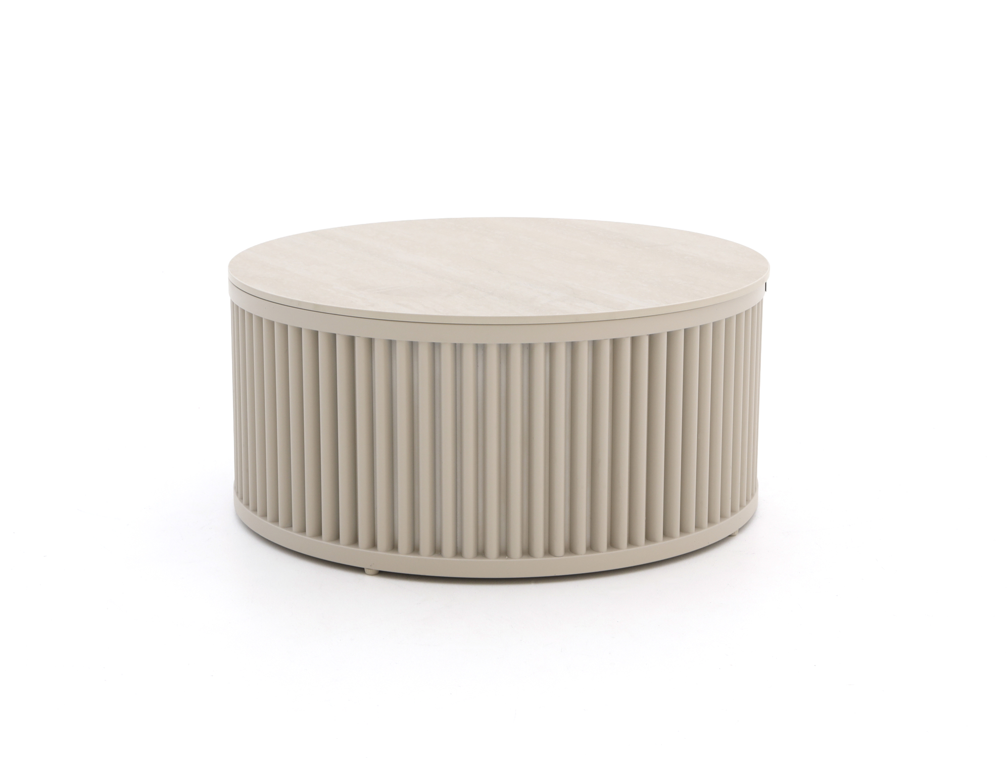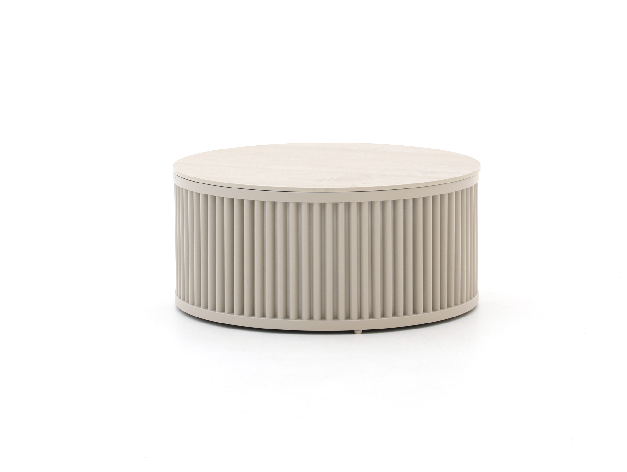 De Bellagio Oriago lounge tuintafelset is een ronde set van twee lage tafels, ideaal als je graag lang borrelt of koffiedrinkt bij je loungeset. Dankzij het sintered stone tafelblad in beige travertinlook zet je zonder zorgen glazen en schalen neer, het blad is sterk en blijft lang mooi. Het aluminium onderstel in beige is licht maar stevig, zo verplaats je de tafels makkelijk als je je zithoek anders wilt neerzetten. Met de twee hoogtes (ongeveer 45 en 36 cm) schuif je ze in elkaar voor een compact hoekje, of juist uit elkaar als je meer plek nodig hebt voor hapjes en drankjes. Rond en niet te groot: handig voor een loungehoek op je terras of onder de overkapping, zonder dat het meteen vol staat.