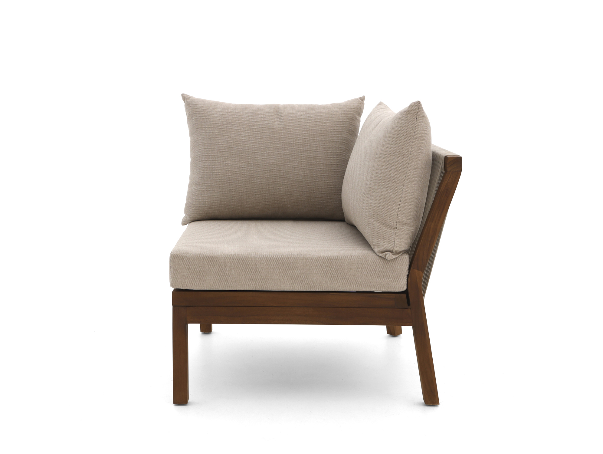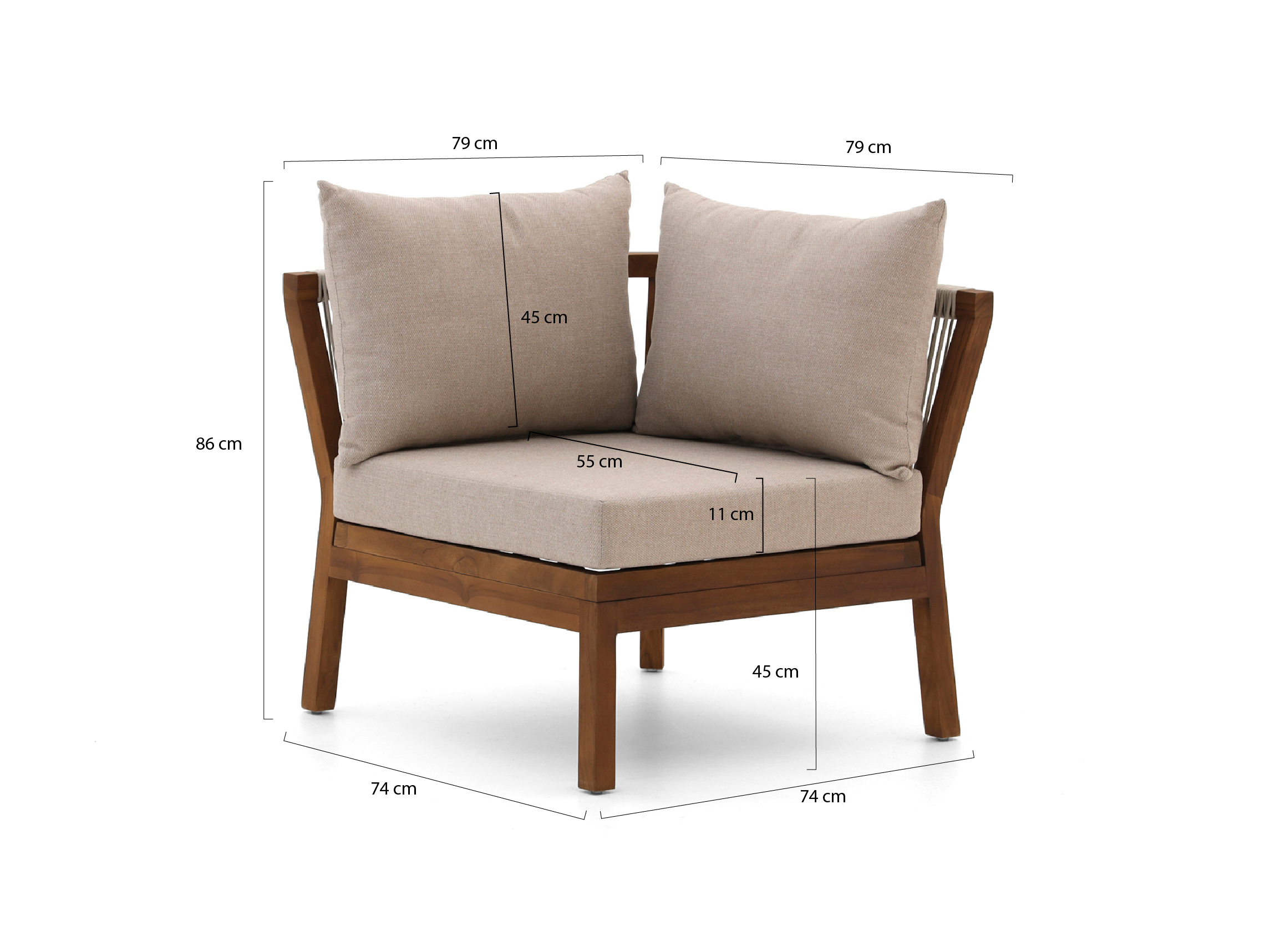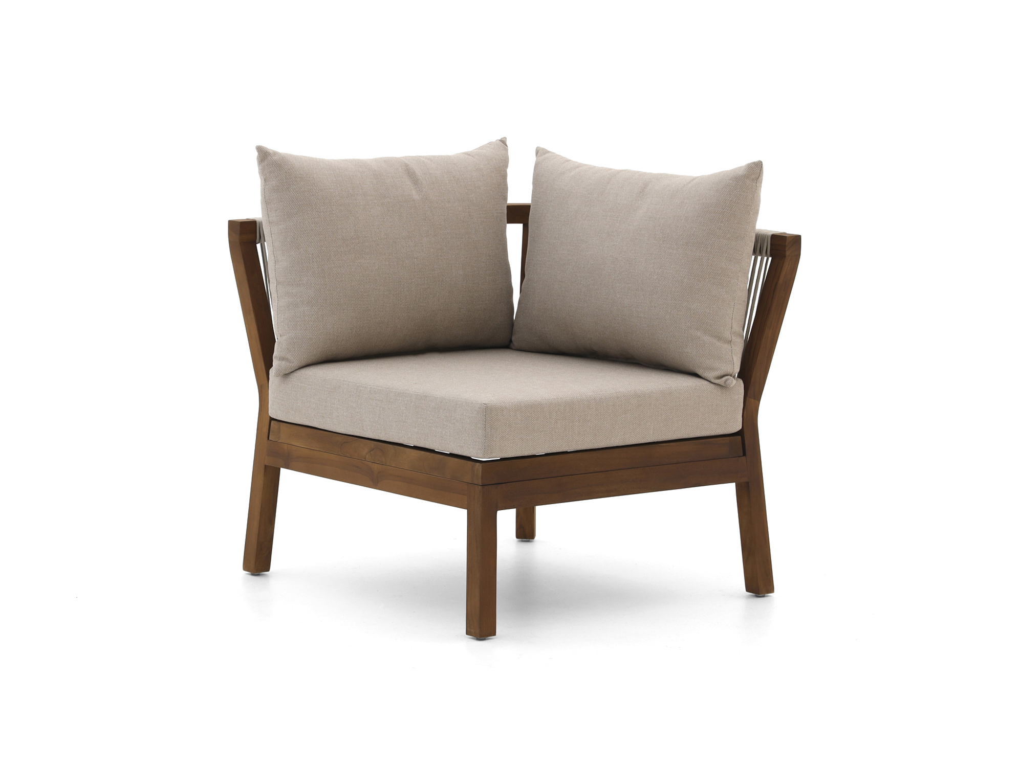 • Teakhouten frame: Je hebt een stevige hoekmodule die het hele jaar buiten kan staan, zonder dat je hem steeds hoeft te verplaatsen.