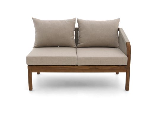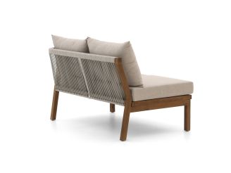 De Bellagio Perzano loungemodule met linker armleuning is een losse loungebank voor 2 personen, perfect als je je bestaande Perzano loungeset wilt uitbreiden of een hoek wilt afmaken. Het teakhouten frame is sterk en kan gewoon buiten staan, terwijl de grijze kussens zorgen voor comfortabel zitten zonder gedoe met losse kussens zoeken. Door de linker armleuning schuif je deze module makkelijk tegen een hoekmodule of andere bank aan, zodat je opstelling netjes aansluit. Met het rope in lichtgrijs krijg je een luchtige rugleuning die prettig zit, ook op warmere dagen. Handig detail: de kussenhoezen zijn afritsbaar, dus die haal je er zo af als je ze wilt reinigen.