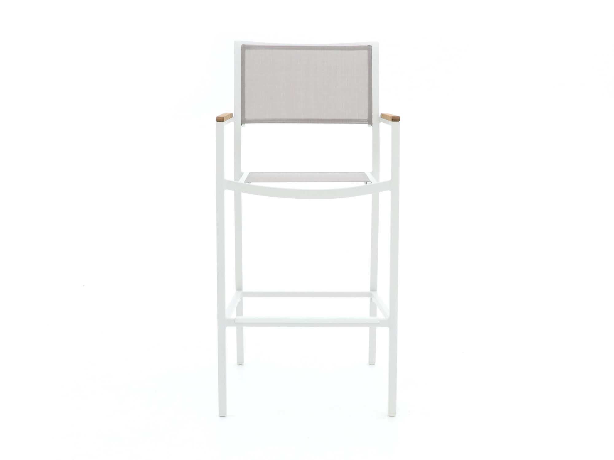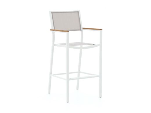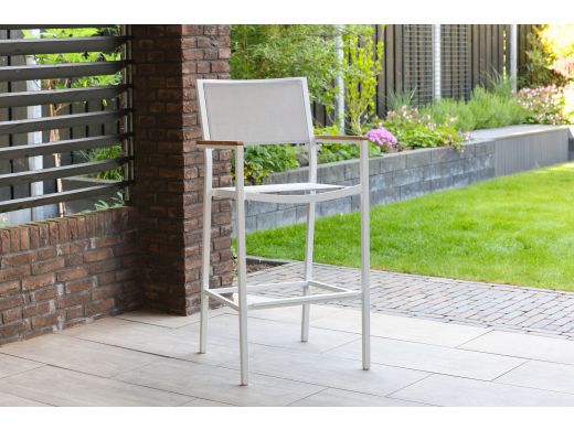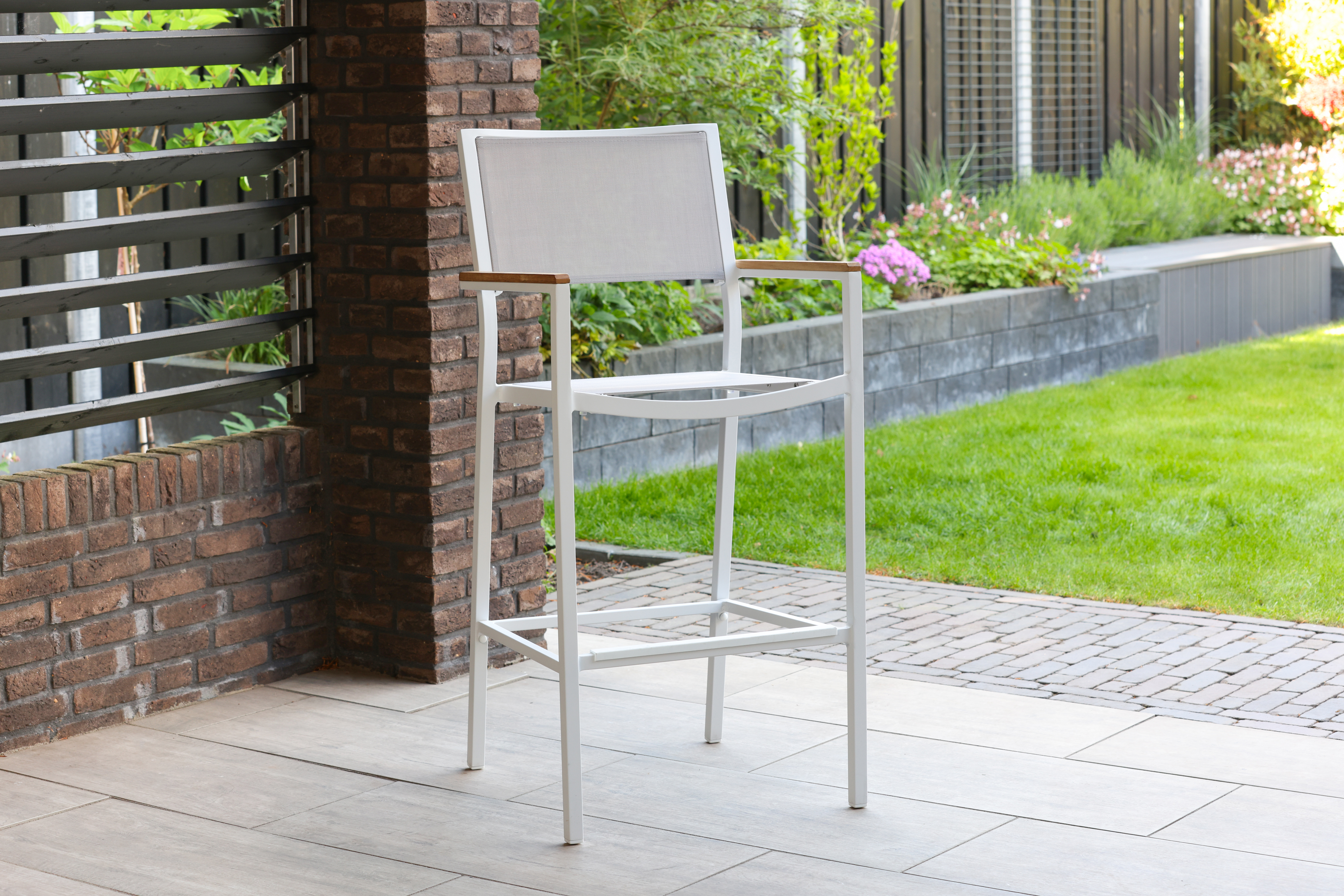 De Bellagio Roma barstoel is een stijlvolle toevoeging aan je tuin of terras. Deze moderne barstoel combineert een stevig aluminium frame met een comfortabele textileen zitting, waardoor je urenlang kunt genieten zonder in te boeten op zitcomfort. De armleuningen zijn gemaakt van teak, wat niet alleen een warme uitstraling geeft, maar ook bestand is tegen alle weersomstandigheden. Deze combinatie van materialen zorgt ervoor dat de barstoel onderhoudsarm is en lang meegaat. Perfect voor een gezellige borrelavond met vrienden, want wie wil er nou niet op een wolkje zitten?