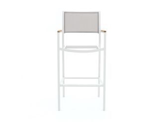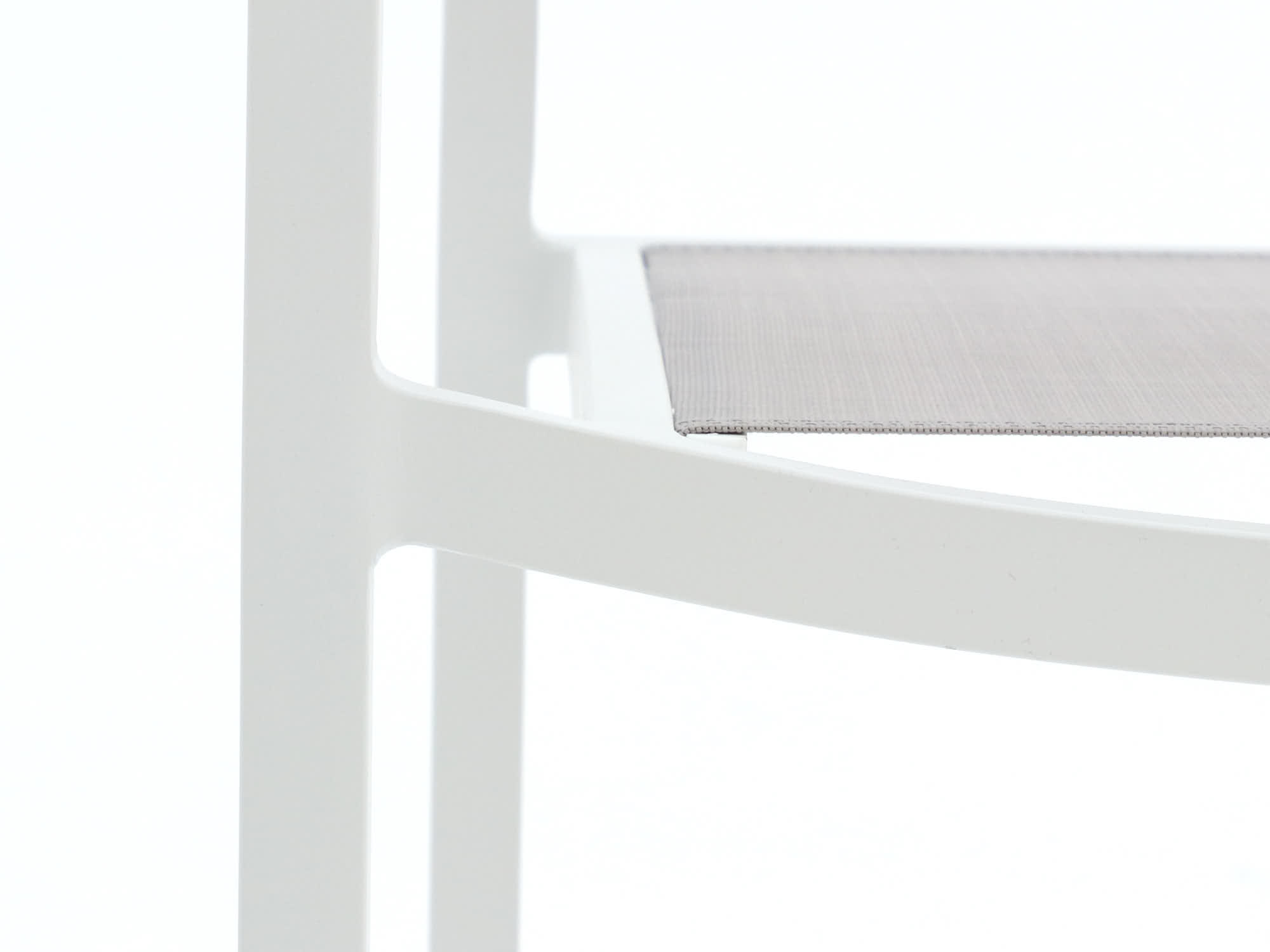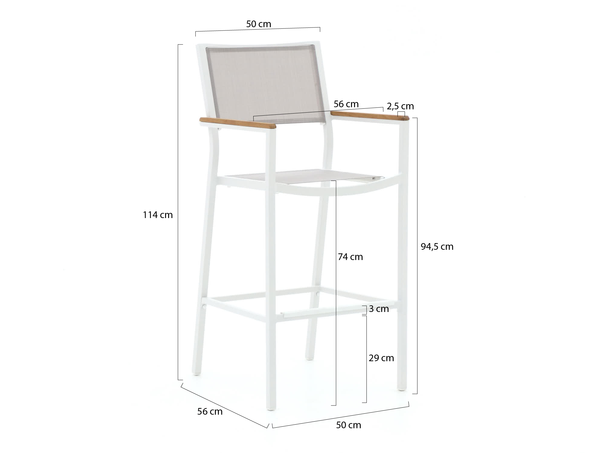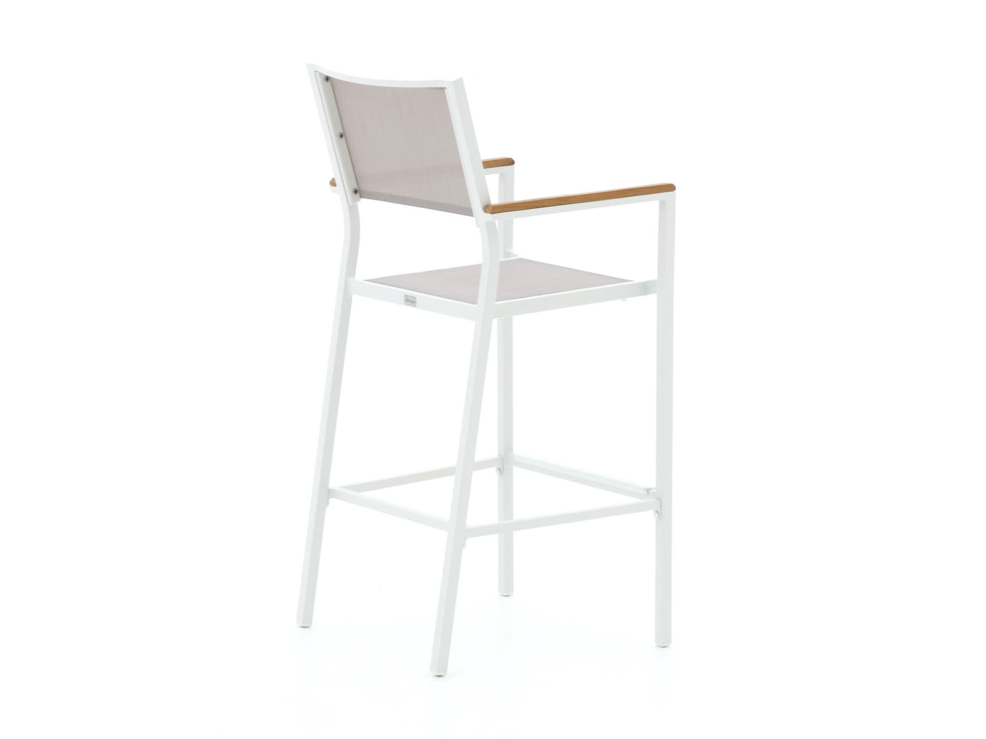 De Bellagio Roma barstoel is een stijlvolle toevoeging aan je tuin of terras. Deze moderne barstoel combineert een stevig aluminium frame met een comfortabele textileen zitting, waardoor je urenlang kunt genieten zonder in te boeten op zitcomfort. De armleuningen zijn gemaakt van teak, wat niet alleen een warme uitstraling geeft, maar ook bestand is tegen alle weersomstandigheden. Deze combinatie van materialen zorgt ervoor dat de barstoel onderhoudsarm is en lang meegaat. Perfect voor een gezellige borrelavond met vrienden, want wie wil er nou niet op een wolkje zitten?
