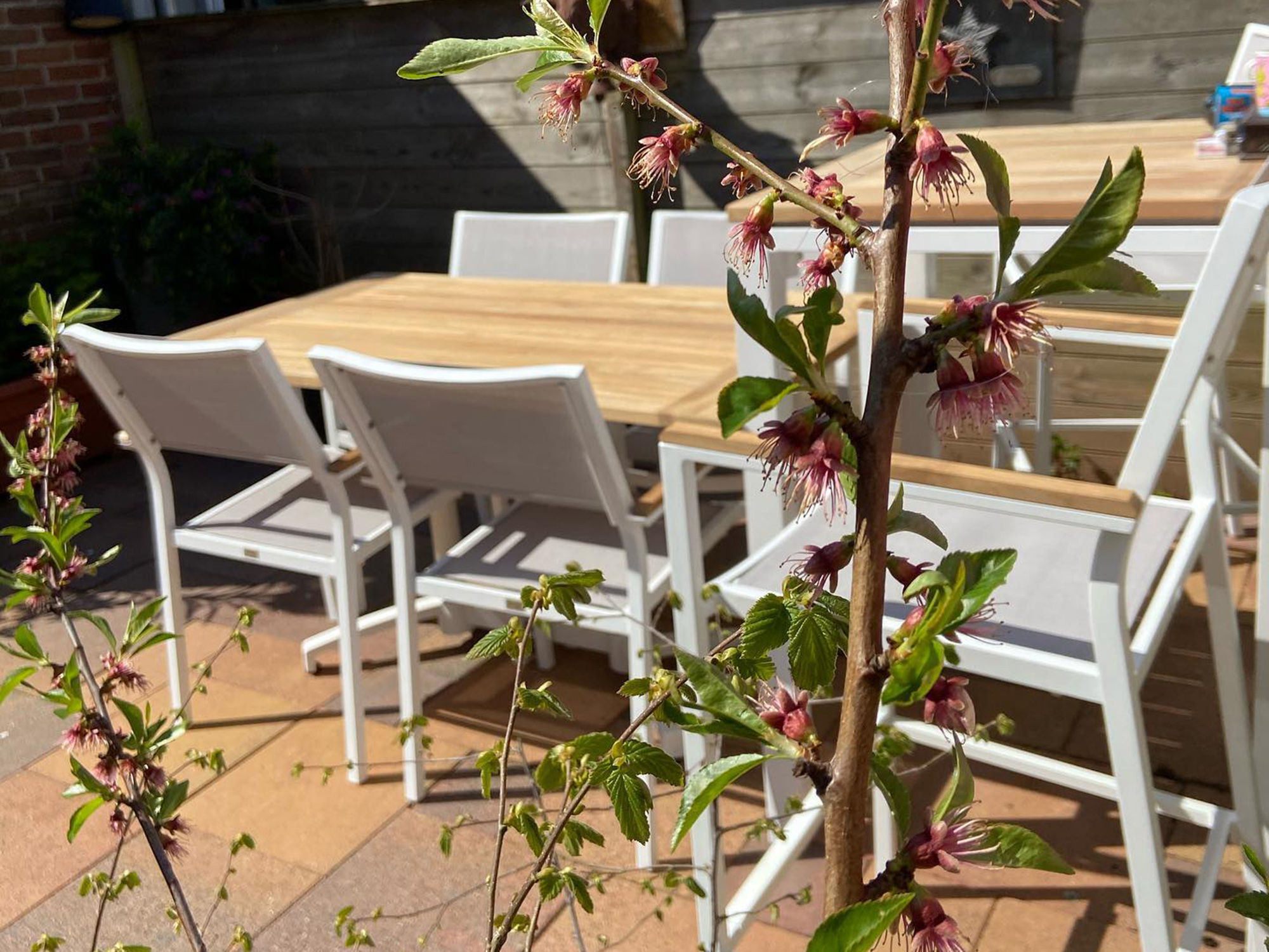 Teak armleuningen: Deze geven de stoel een warme uitstraling en zijn bestand tegen alle weersomstandigheden, ideaal voor buitengebruik.