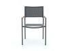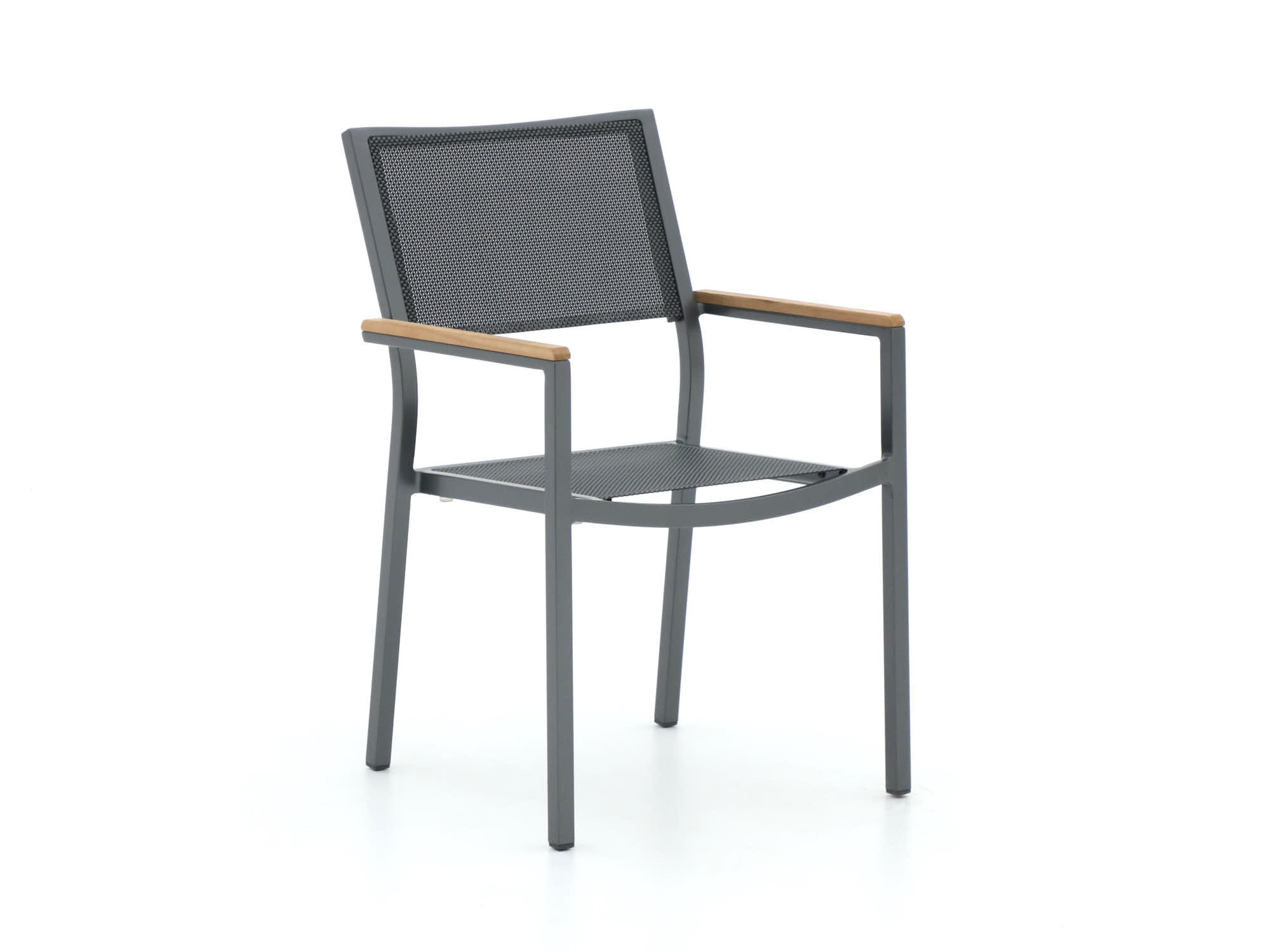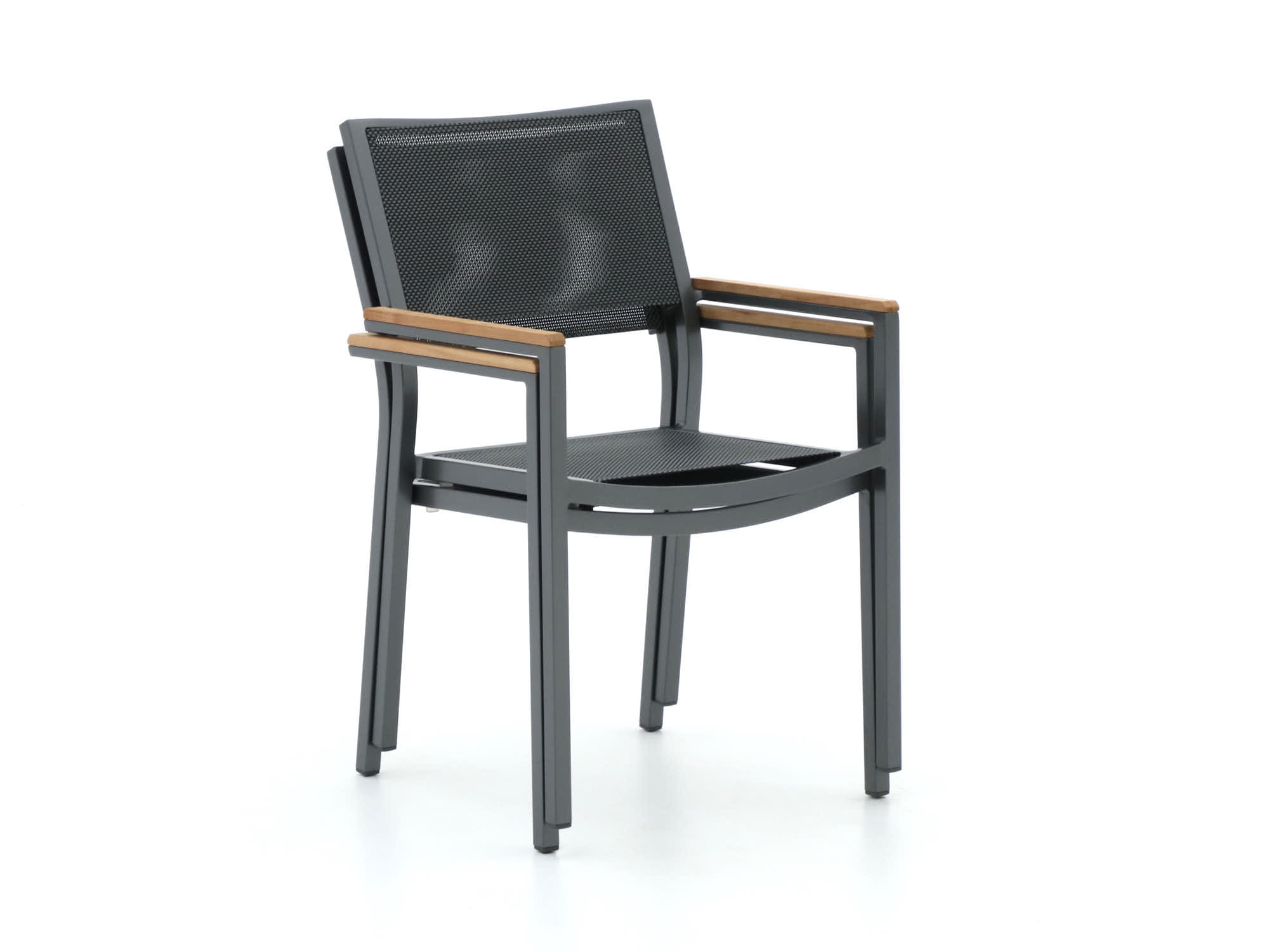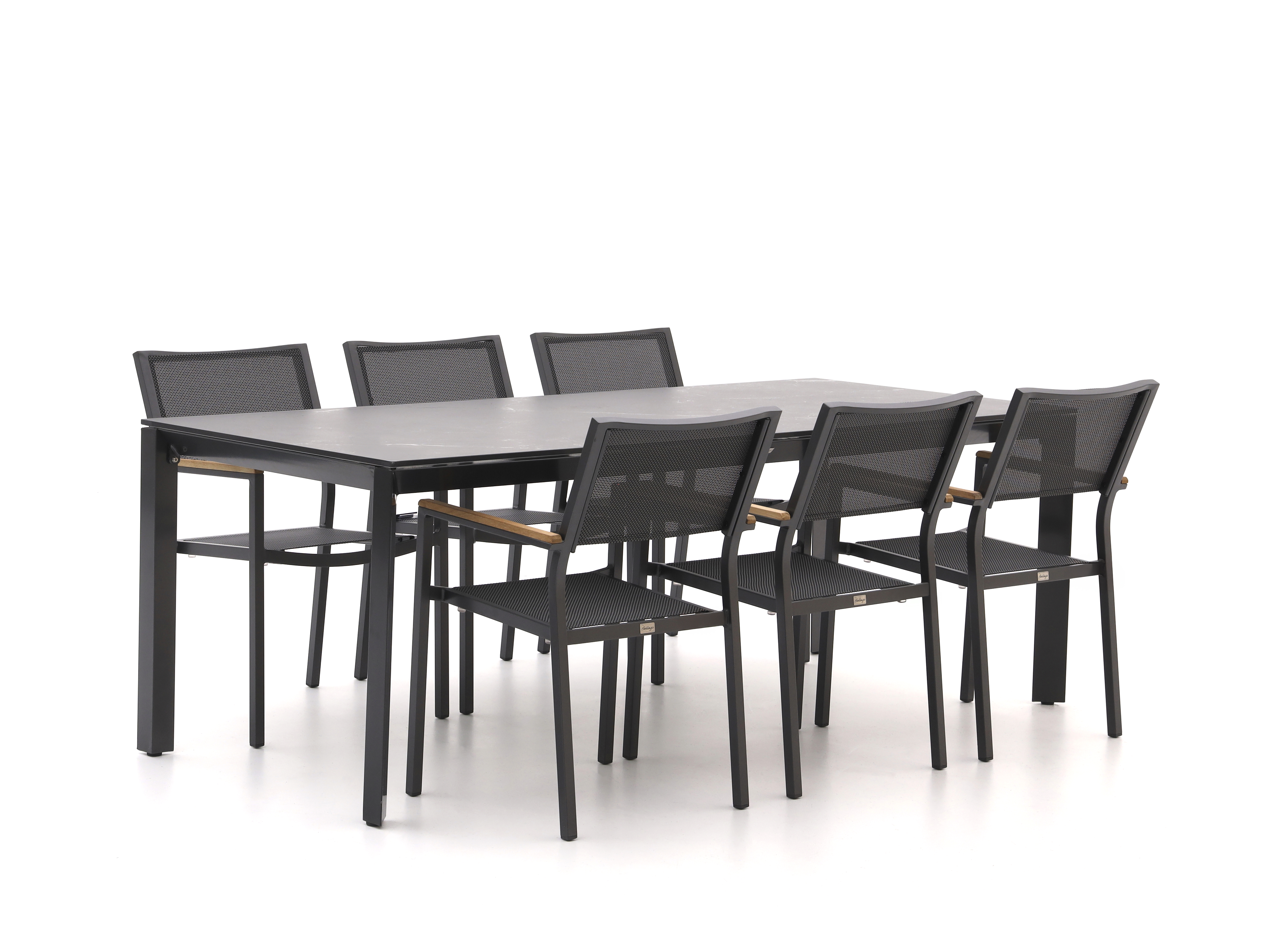 Dit is een stevige diningset met een 220 cm rechthoekige tafel en zes stoelen, genoeg ruimte voor etentjes met vrienden of familie. Het blad is van sintered stone in zwart, dat weinig opneemt en makkelijk schoon te maken is als er geknoeid wordt. De zittingen zijn van textileen en de armleuningen van teak, een eenvoudige mix van comfort en een warme touch. De stoelen zijn stapelbaar, handig als je ze compact wilt opbergen.