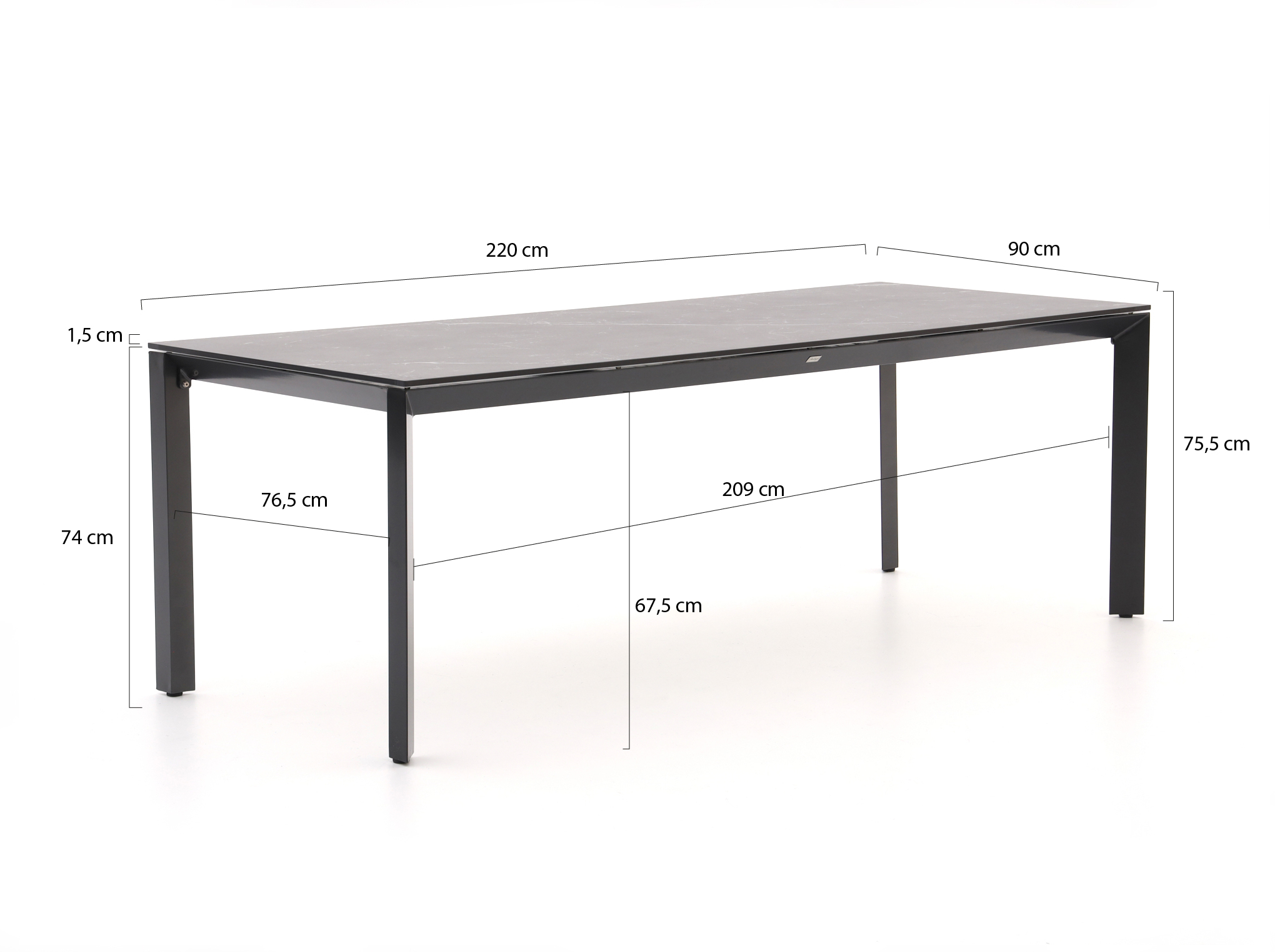 220 cm tafel voor 6 personen: Genoeg ruimte om met z'n zessen aan te eten zonder dat iedereen aan elkaar vastkleeft; ideaal voor langere diners of om serveerschalen neer te zetten.