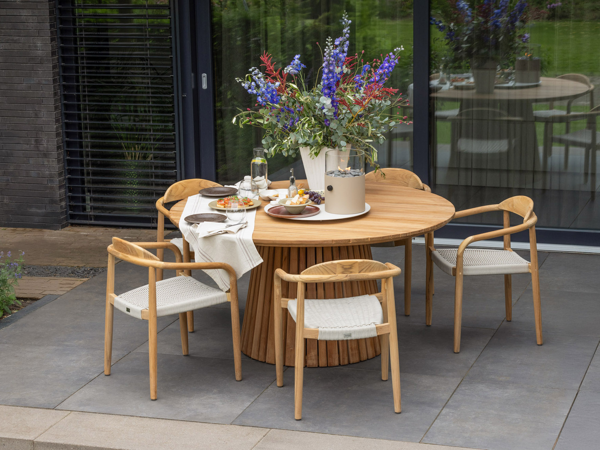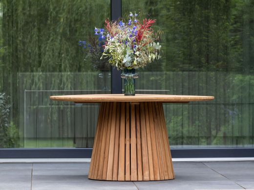 Teakhouten constructie: Gemaakt van duurzaam teakhout dat bestand is tegen alle weersomstandigheden. Dit betekent dat je de tafel het hele jaar door buiten kunt laten staan zonder dat het hout beschadigt.