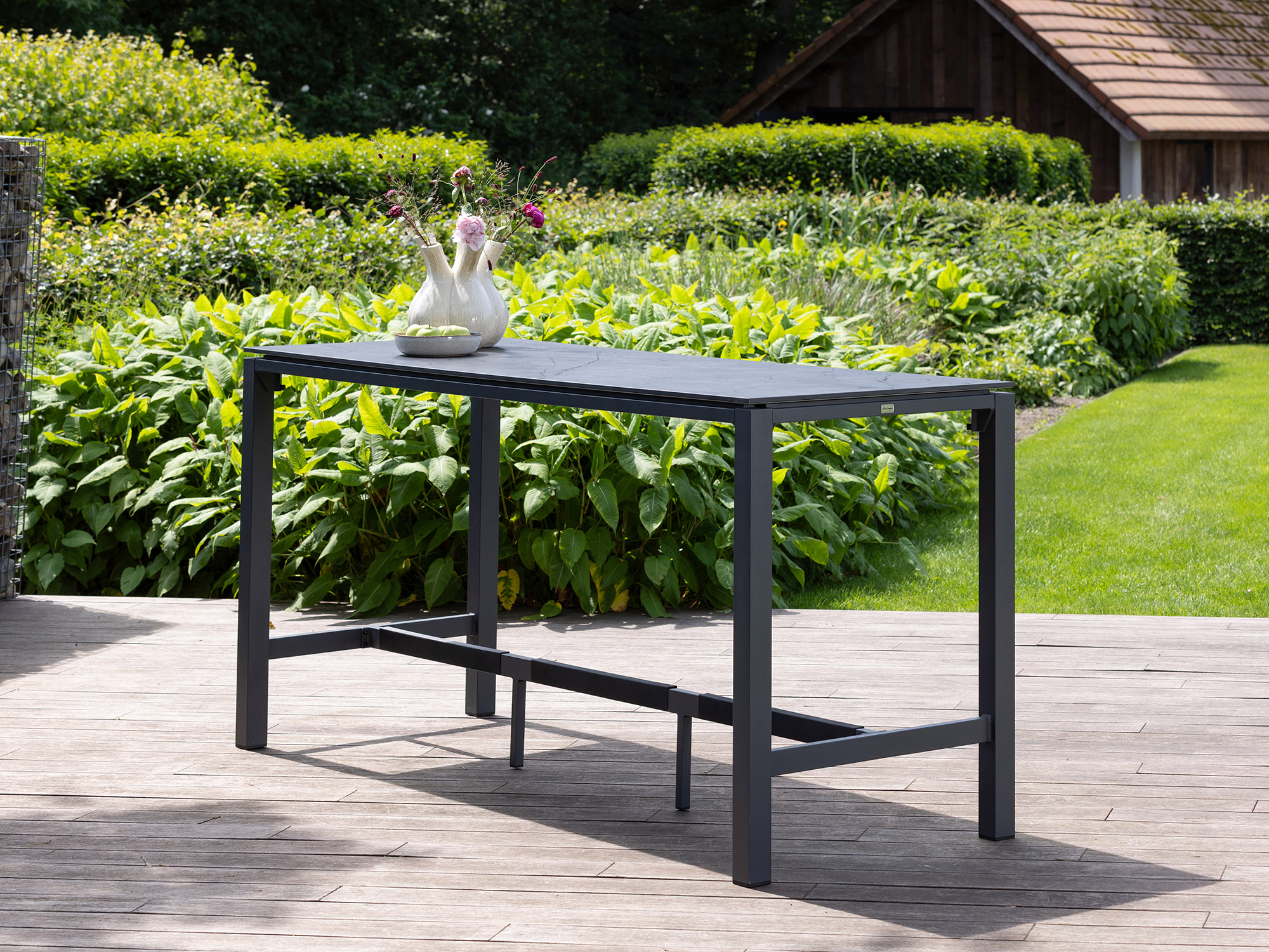 De Bellagio Trecenta is een lange bartafel voor wie graag met een groep borrelt of eet, maar niet de hele avond “vast” wil zitten. Door de hoogte van 105 cm kun je er zowel staand als zittend aan hangen en dankzij het smalle formaat van 75 cm past hij goed op langere, smallere terrassen. Het blad van zwart Sintered Stone is sterk en krasbestendig, waardoor je zonder zorgen schalen, glazen en flessen neerzet. Het aluminium onderstel in het zwart is licht van gewicht en roest niet, dus je tafel blijft lang netjes buiten. Deze bartafel is 225 cm lang en biedt plek aan ongeveer 6 personen: ideaal voor lange zomeravonden met vrienden of familie.